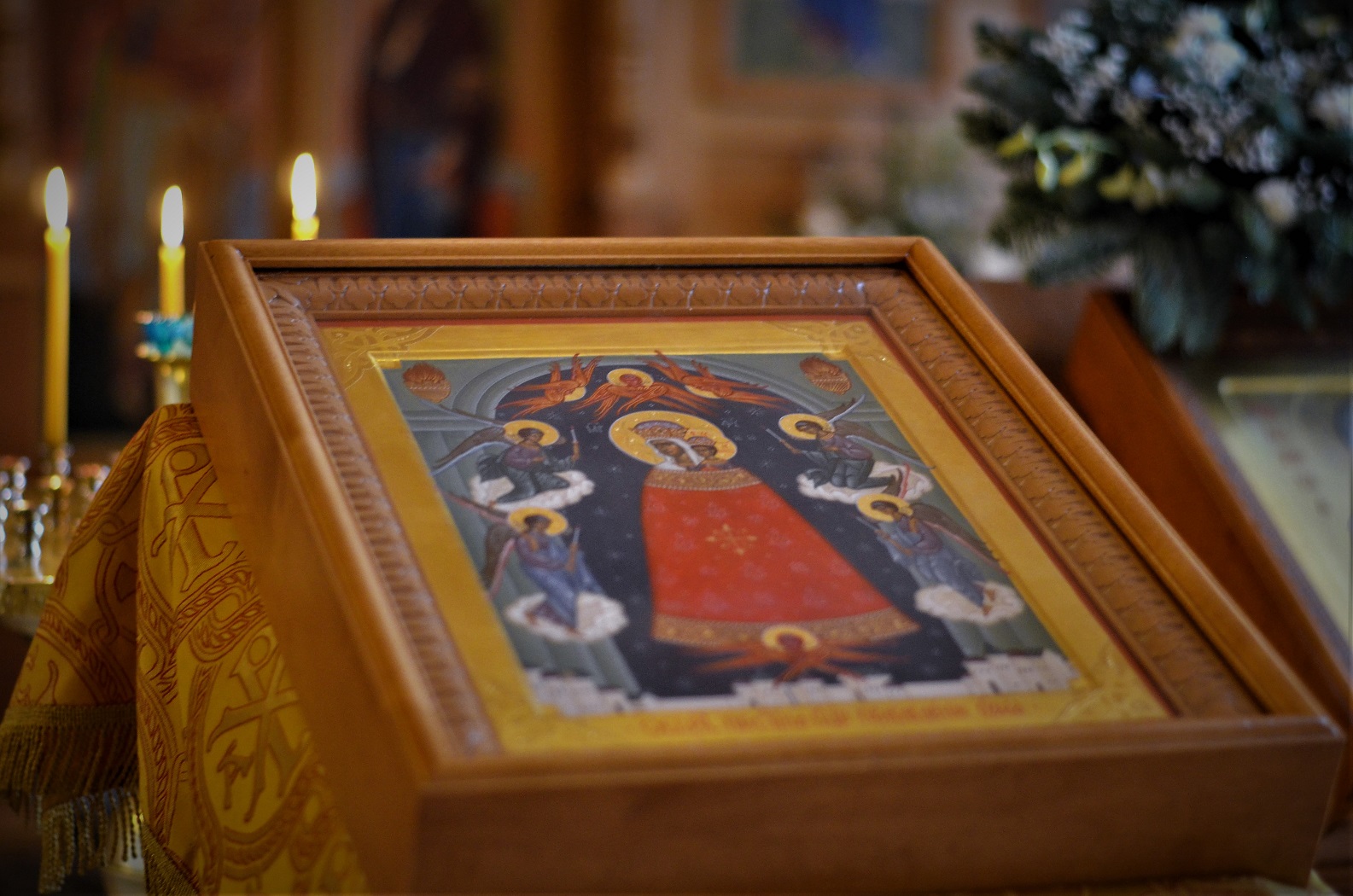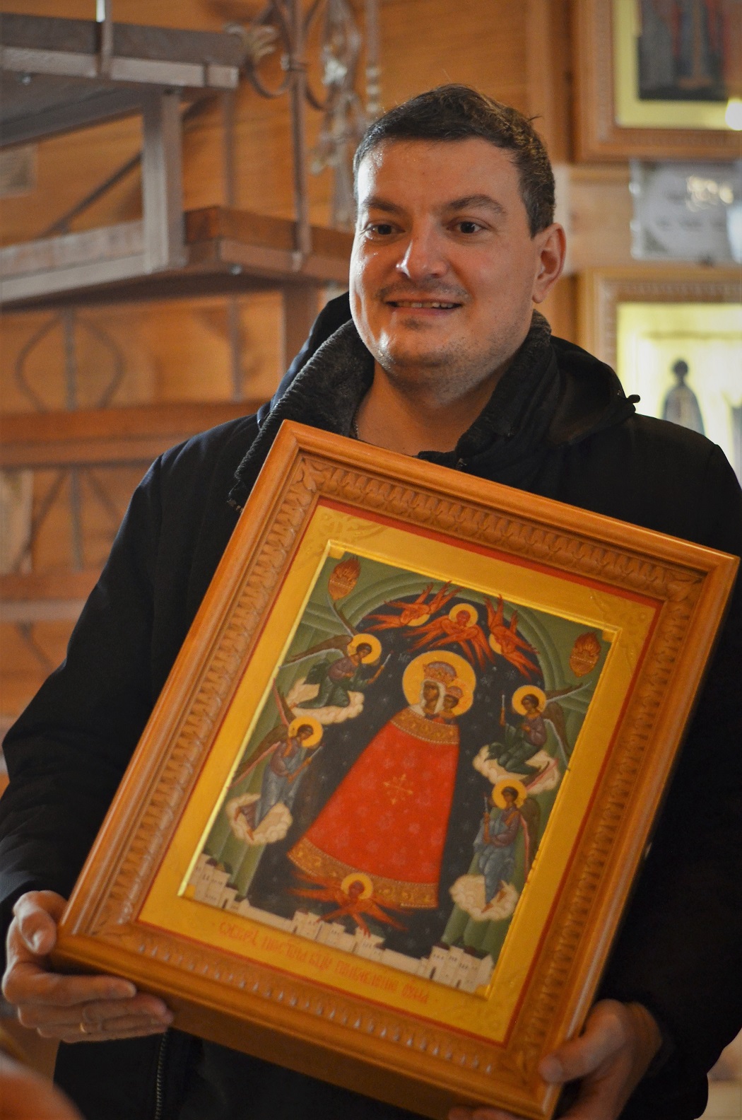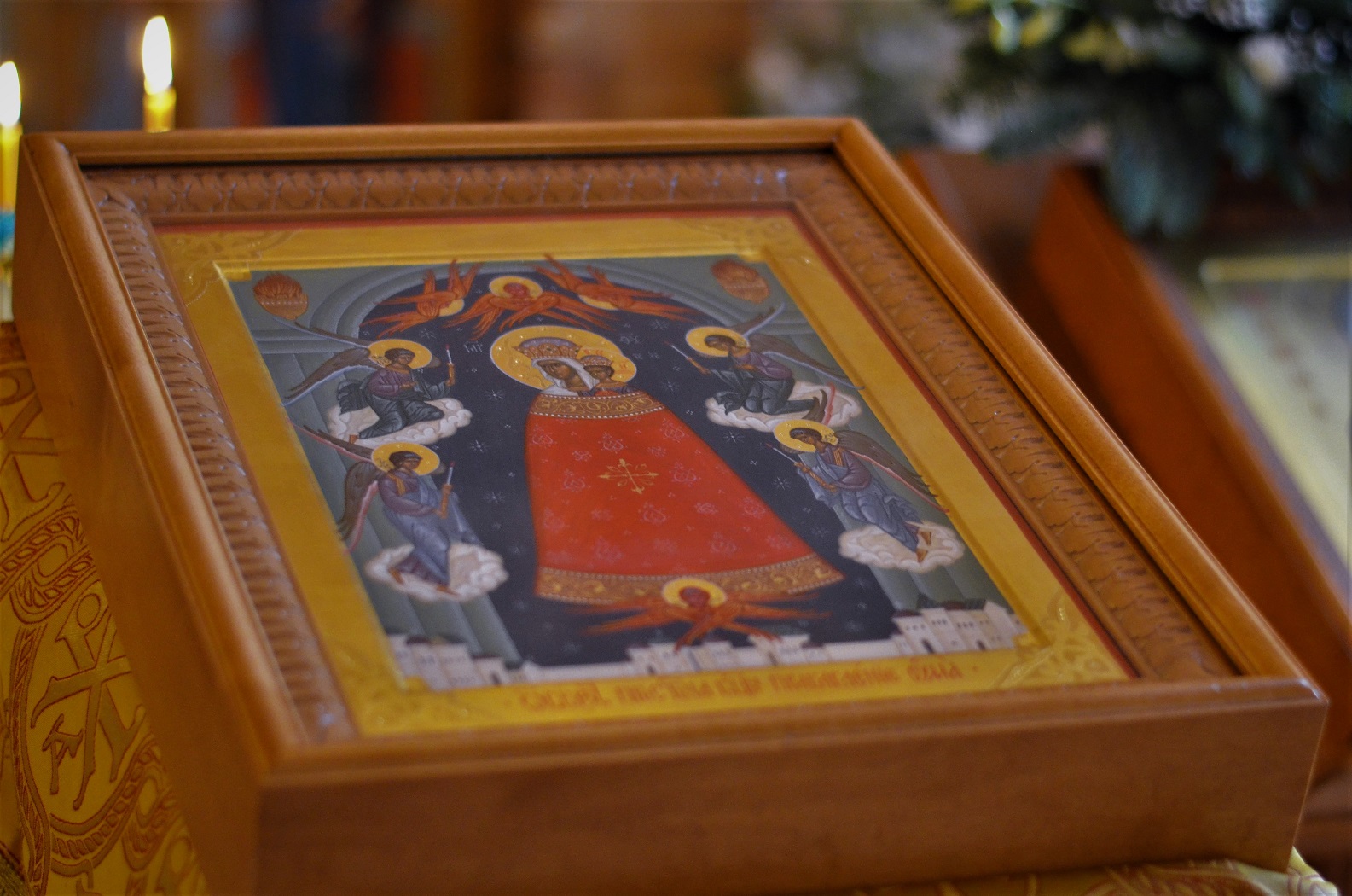 После освящения иконы настоятель храма иерей Иоанн Омелянчук поблагодарил прихожан, которые внесли пожертвование на написание иконы, а затем рассказал кратко о происхождении иконы. Иконография образа сложилась в XVI веке под влиянием западных гравюр и икон со сложной символикой. На них Пресвятая Дева и Богомладенец изображаются с царскими венцами на главах, при этом Христос благословляет правой рукой, а в левой руке Его — держава, символ царской власти. Богоматерь с Младенцем изображается на темнооливковом фоне в лучах Божественного света. Особенность иконы — своеобразные одеяния. Божия Матерь облачена вместе с Богомладенцем в длинный колоколообразный плащ — далматик. Он красного цвета, богато расшит золотыми крестами и украшен драгоценными камнями. В верхних углах иконы — лампады с языками пламени. Пречистая Дева изображена на фоне звездного неба, открывающегося под аркой портала. С обеих сторон подлетают к Богоматери с Младенцем Ангелы с зажженными свечами; над главами Их — три Серафима, в подножии — Херувим с распростертыми крыльями. Внизу виднеется город, символ Горнего Иерусалима.