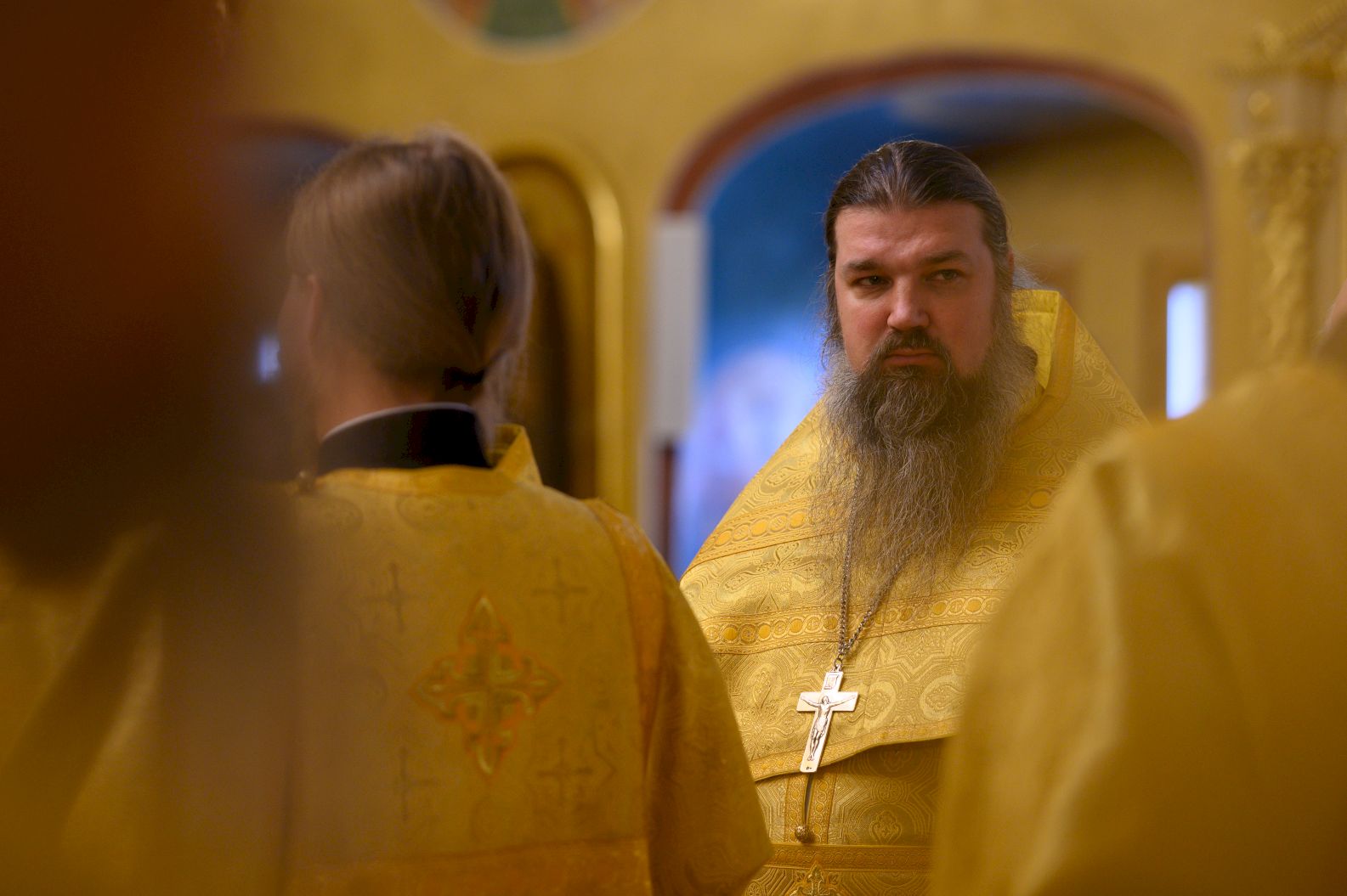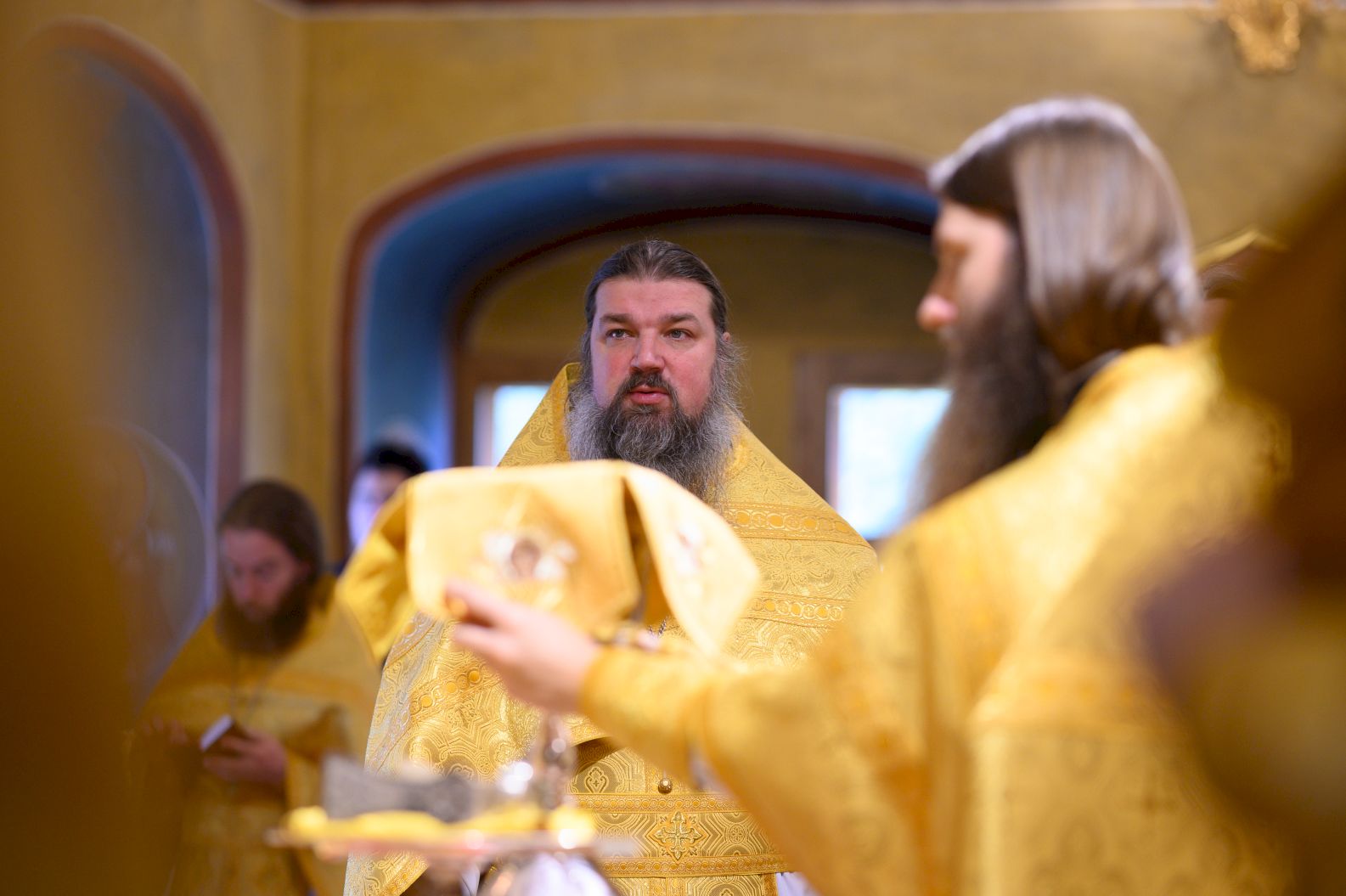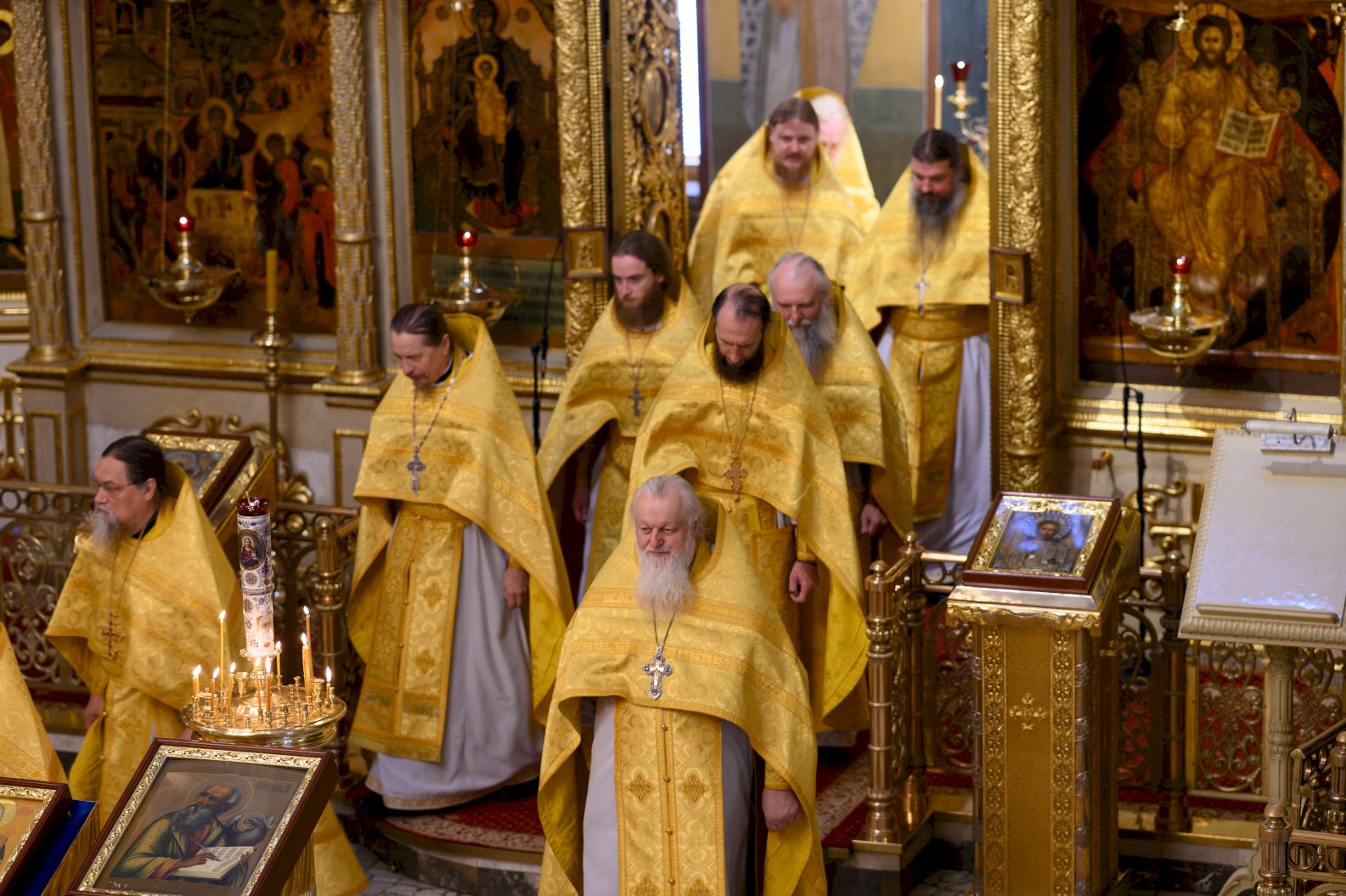 По заамвонной молитве священники и диаконы спели славление апостолу Иоанну Богослову и святителю Тихону, патриарху Московскому и всея Руси.