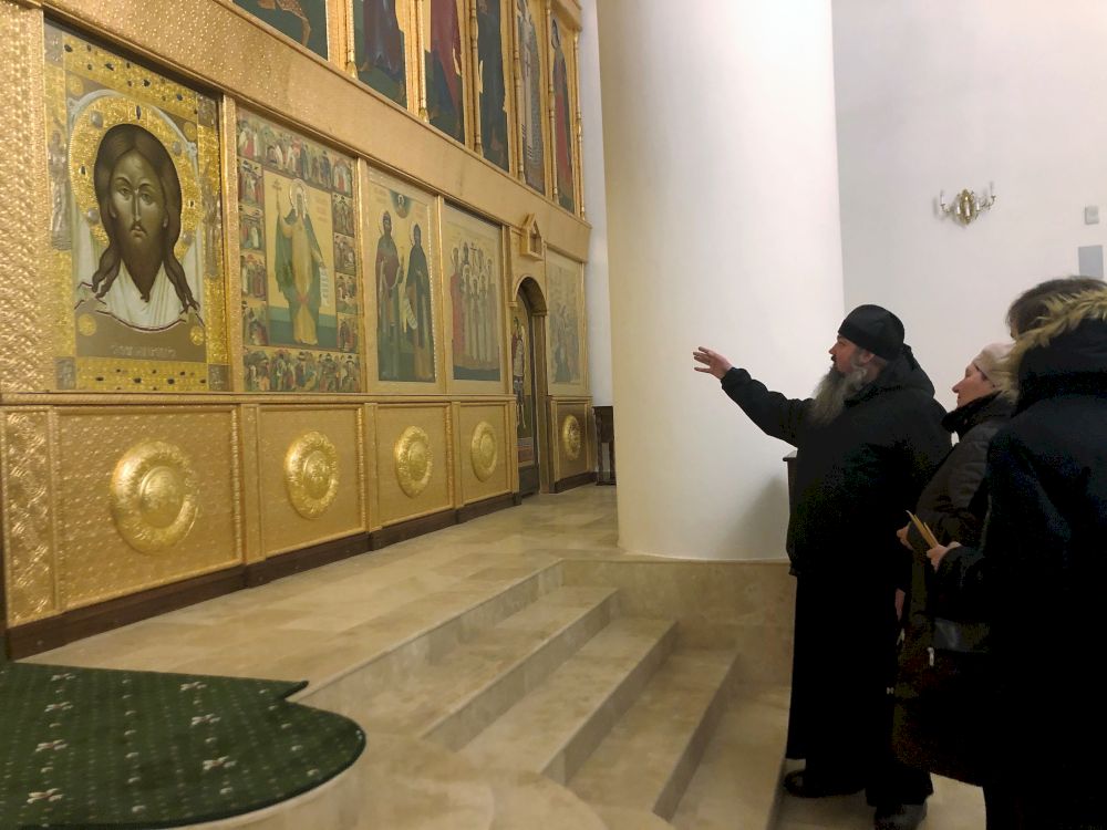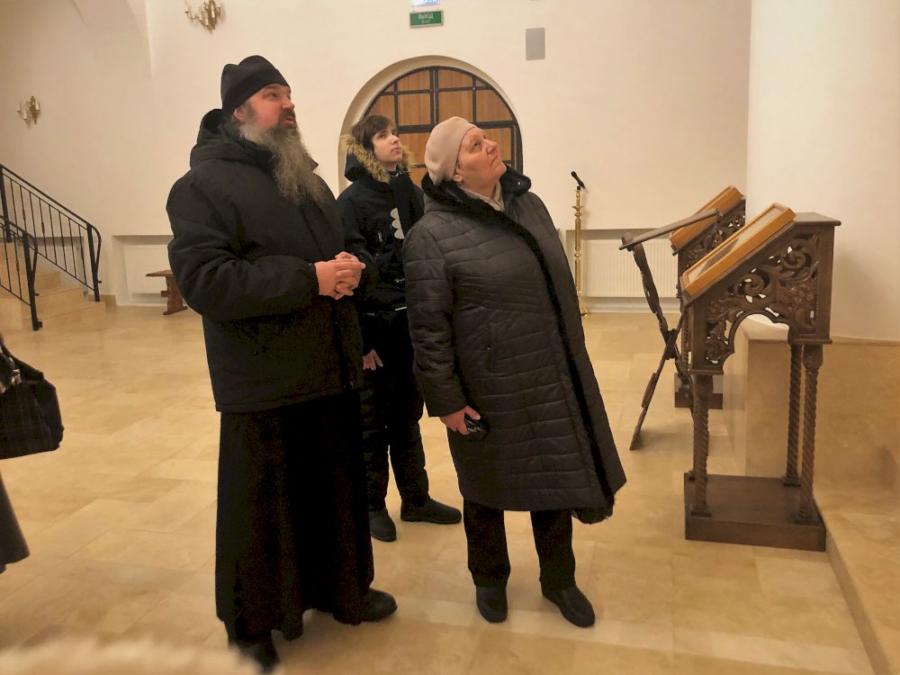 Экскурсию провел настоятель храма иерей Иоанн Омелянчук, которая началась с крестильного придела в честь преподобного Сергия Радонежского, где иерей Иоанн рассказал об устройстве храма, ответил на вопросы по созданию храма, затем экскурсия продолжилась в основном храме в честь Патриарха Ермогена, где все смогли увидеть главные храмовые иконы, полюбоваться росписями и иконостасом, рассмотреть расписанный купол храма. Большое впечатление произвела на всех колокольня с открывающейся панорамой.