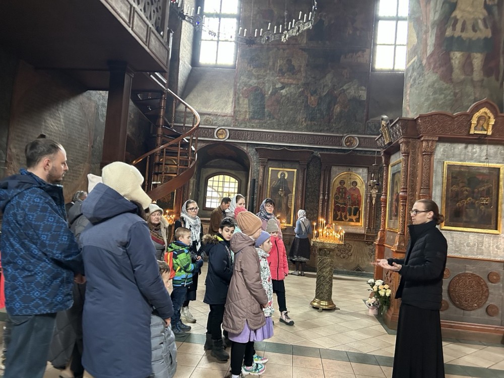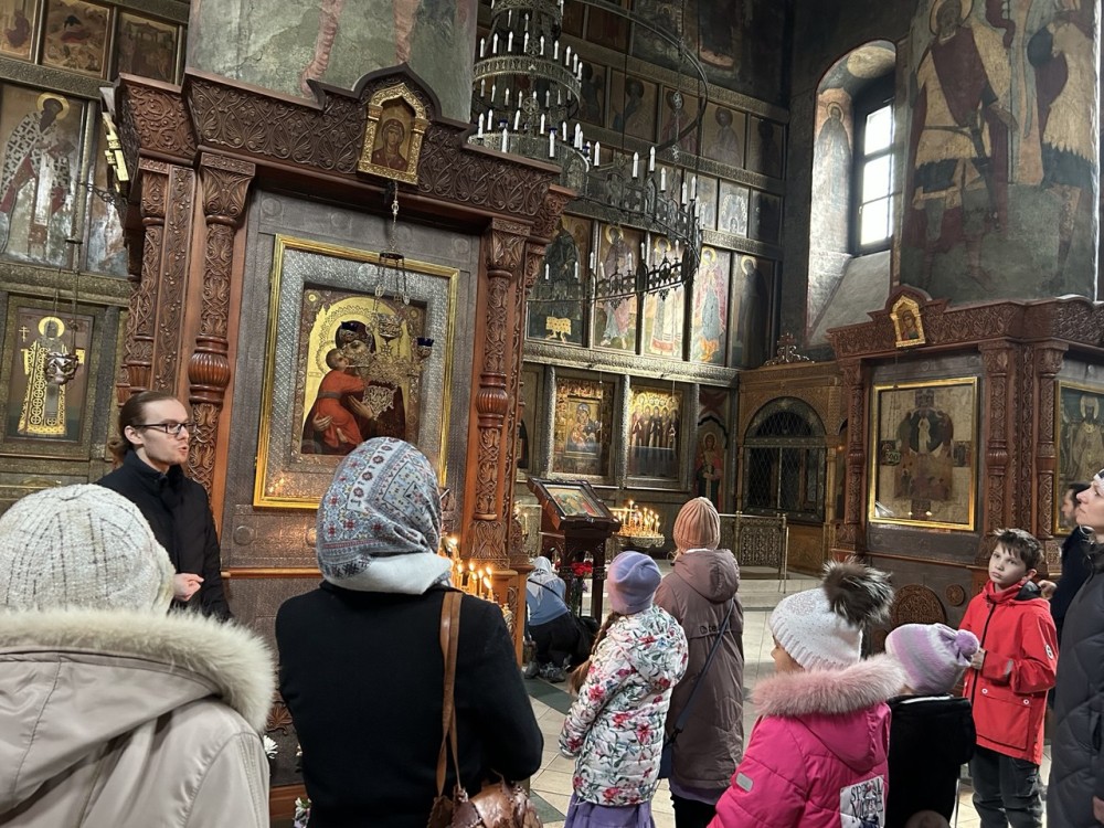 Дети с родителями посетили древнейший храм Сретения Владимирской иконы Божией Матери с фресками XIV века, где познакомились с историей основания обители, а также её непростой судьбой в период гонений на церковь в XX веке.