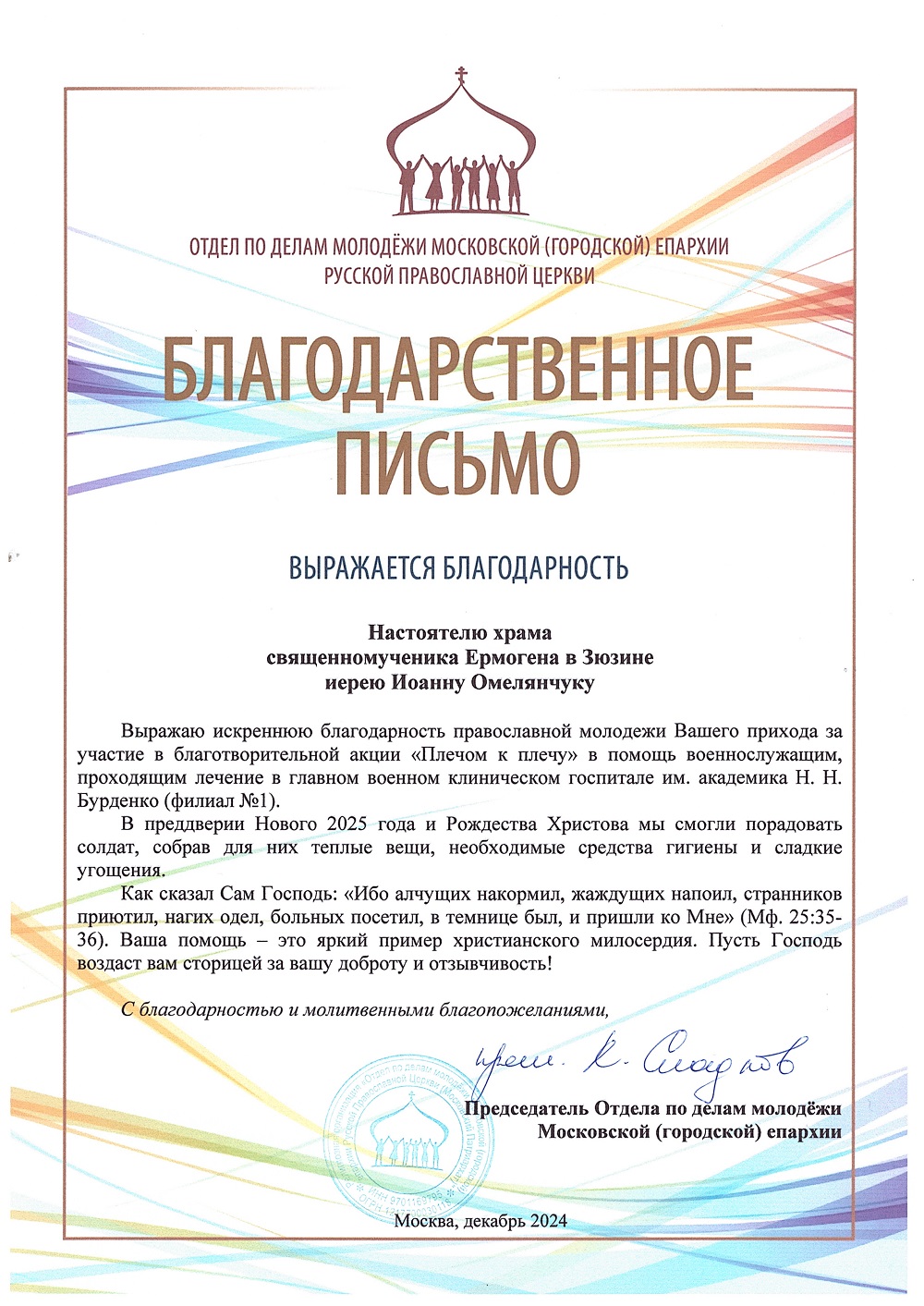 Молодежное объединение "Исток" храма Священномученика Ермогена, Патриарха Московского и всея Руси, чудотворца, Патриаршего подворья в Зюзине приняло участие в благотворительной акции «Плечом к плечу», которая проводилась в декабре 2024 года в помощь военнослужащим, проходящим лечение в главном военном клиническом госпитале им. академика Н.Н. Бурденко (филиал №1). Организатором акции выступил Отдел по делам молодежи Московской епархии.