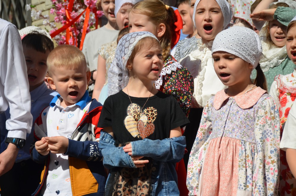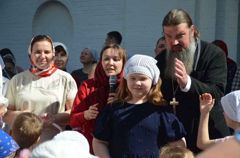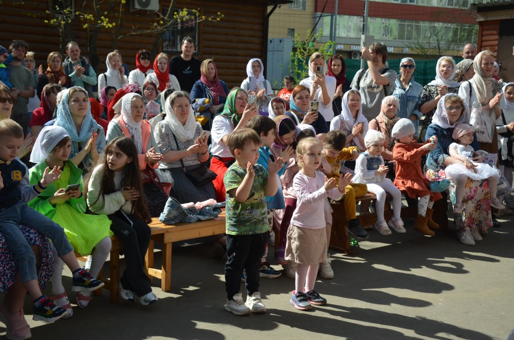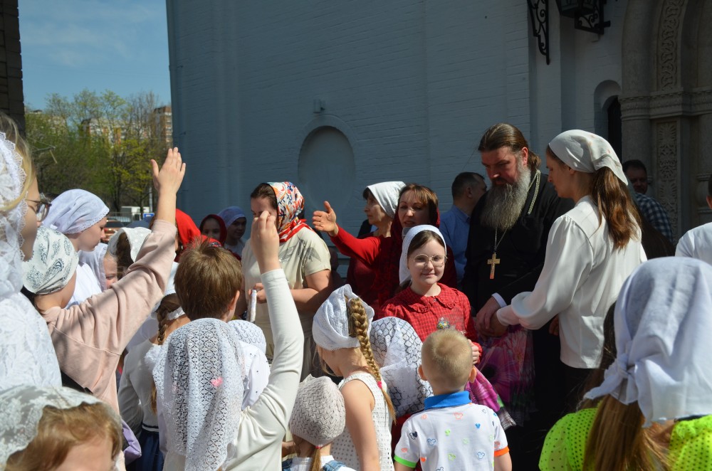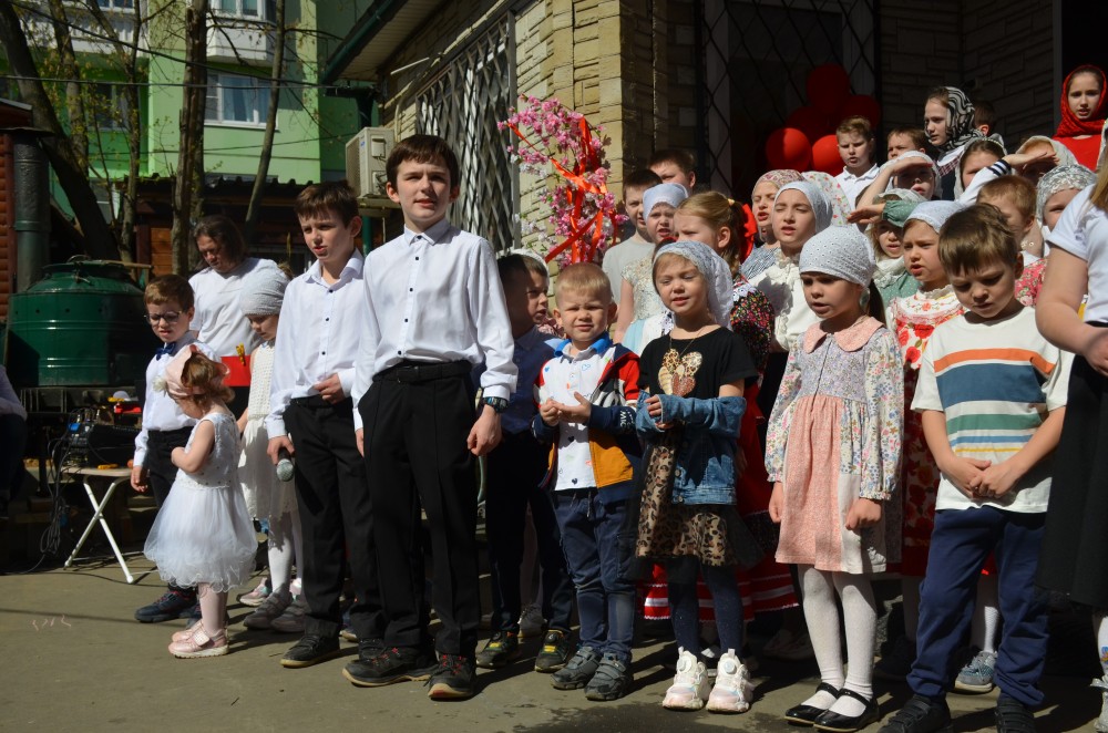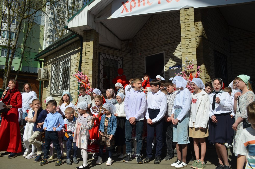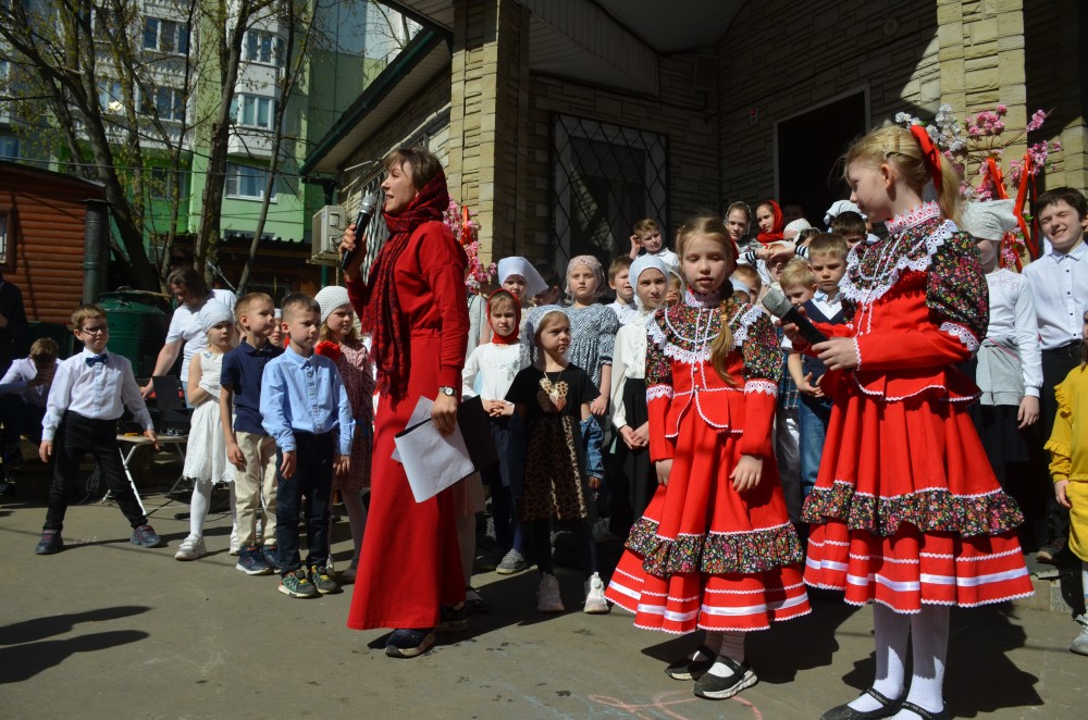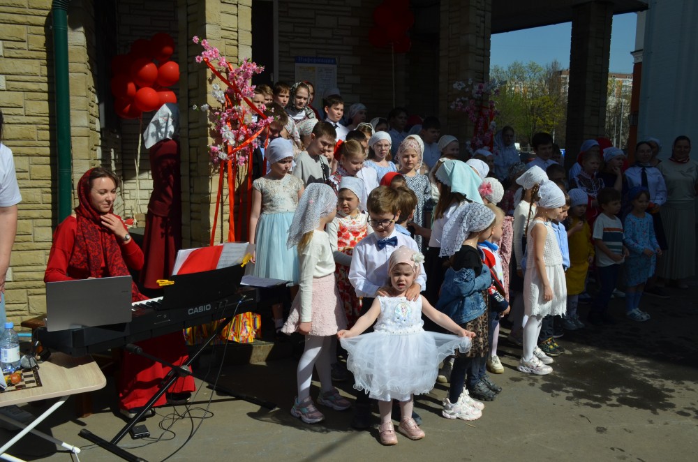 На прихрамовой площади детский хор исполнил праздничные песни под аккомпанемент директора Воскресной школы Екатерины Вадимовны Гришиной.