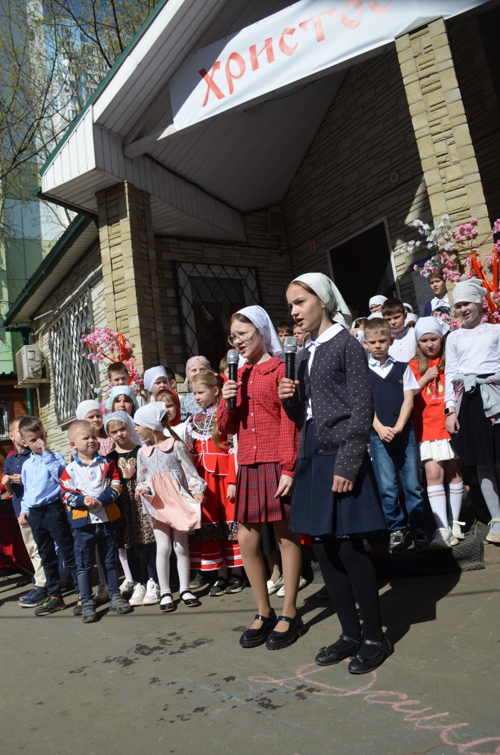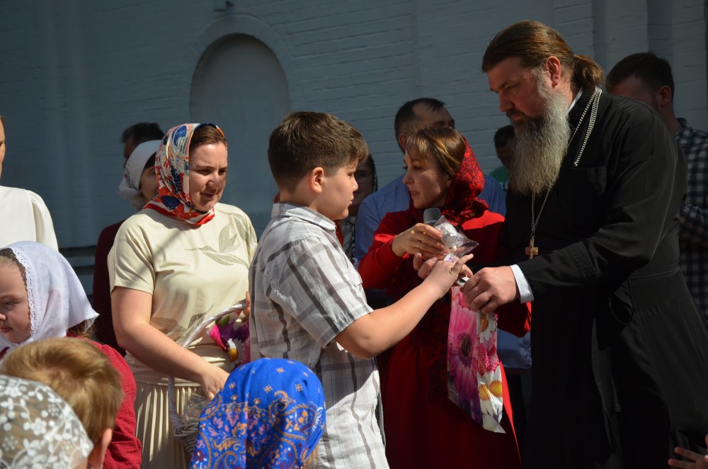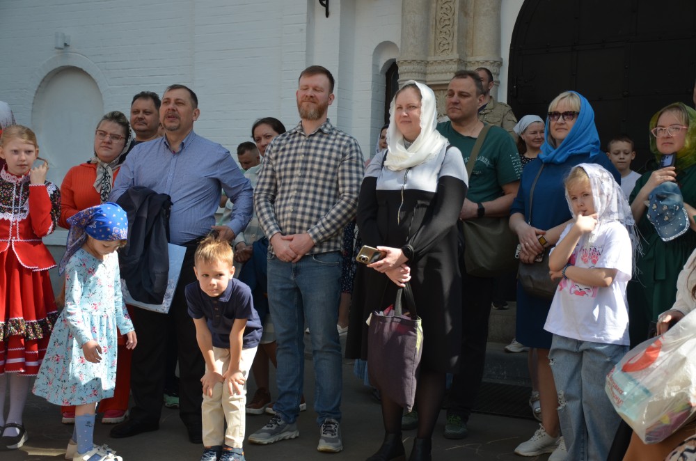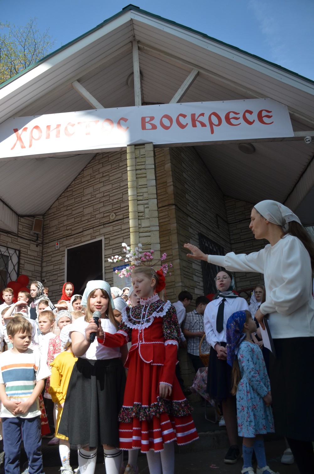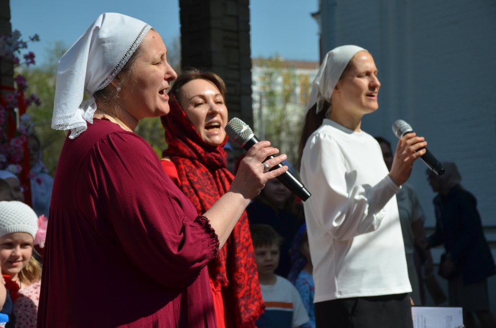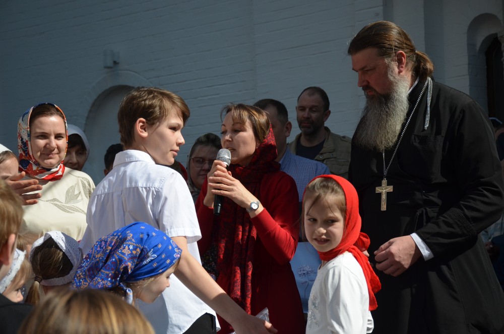 На прихрамовой площади детский хор исполнил праздничные песни под аккомпанемент директора Воскресной школы Екатерины Вадимовны Гришиной.