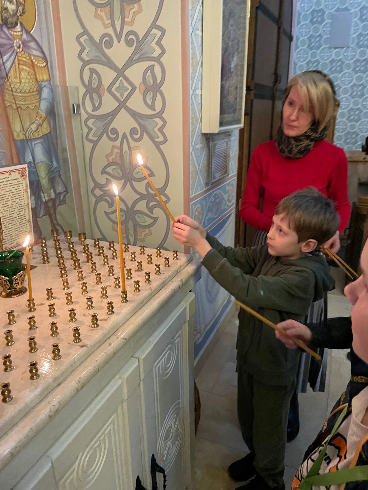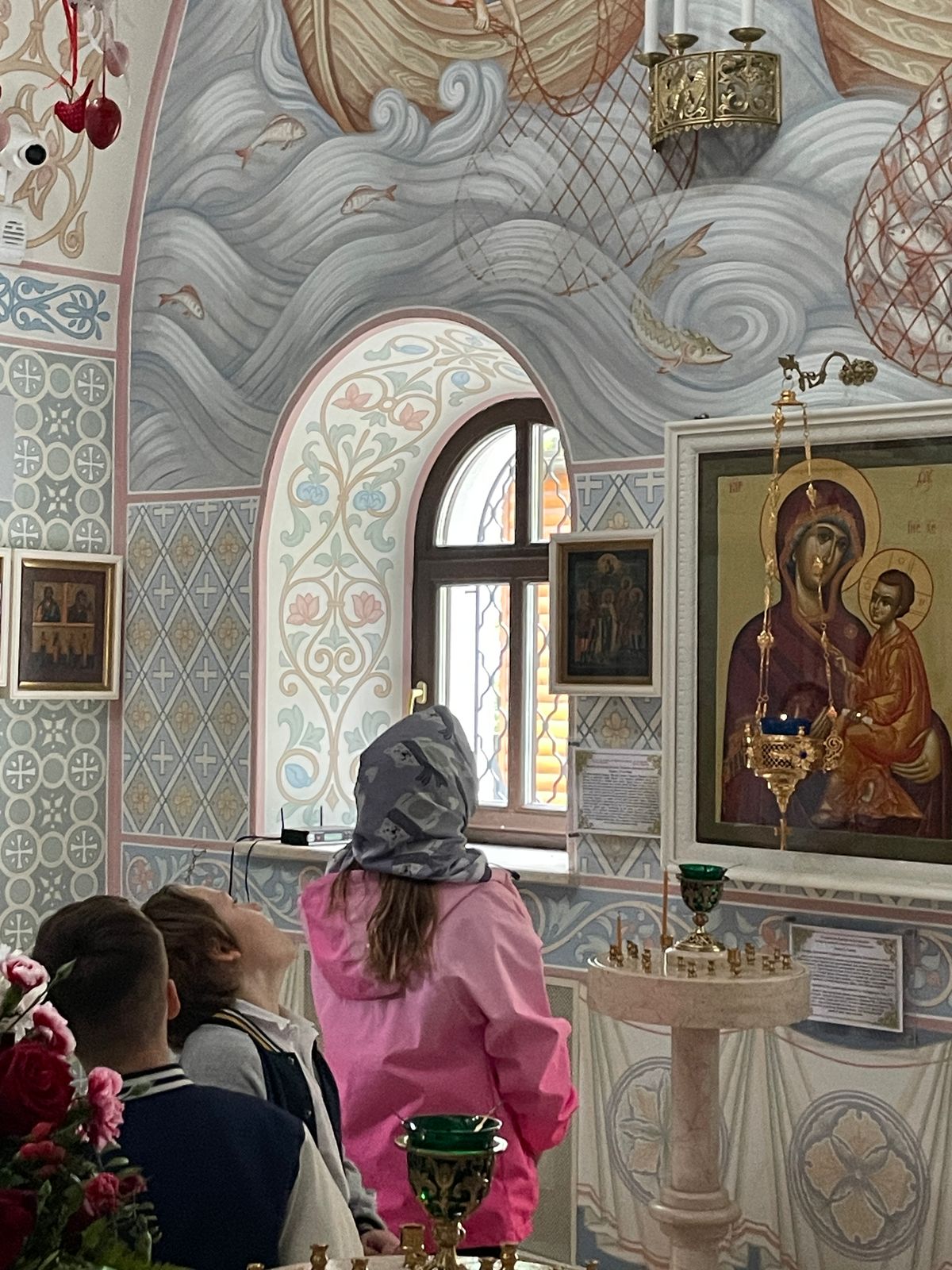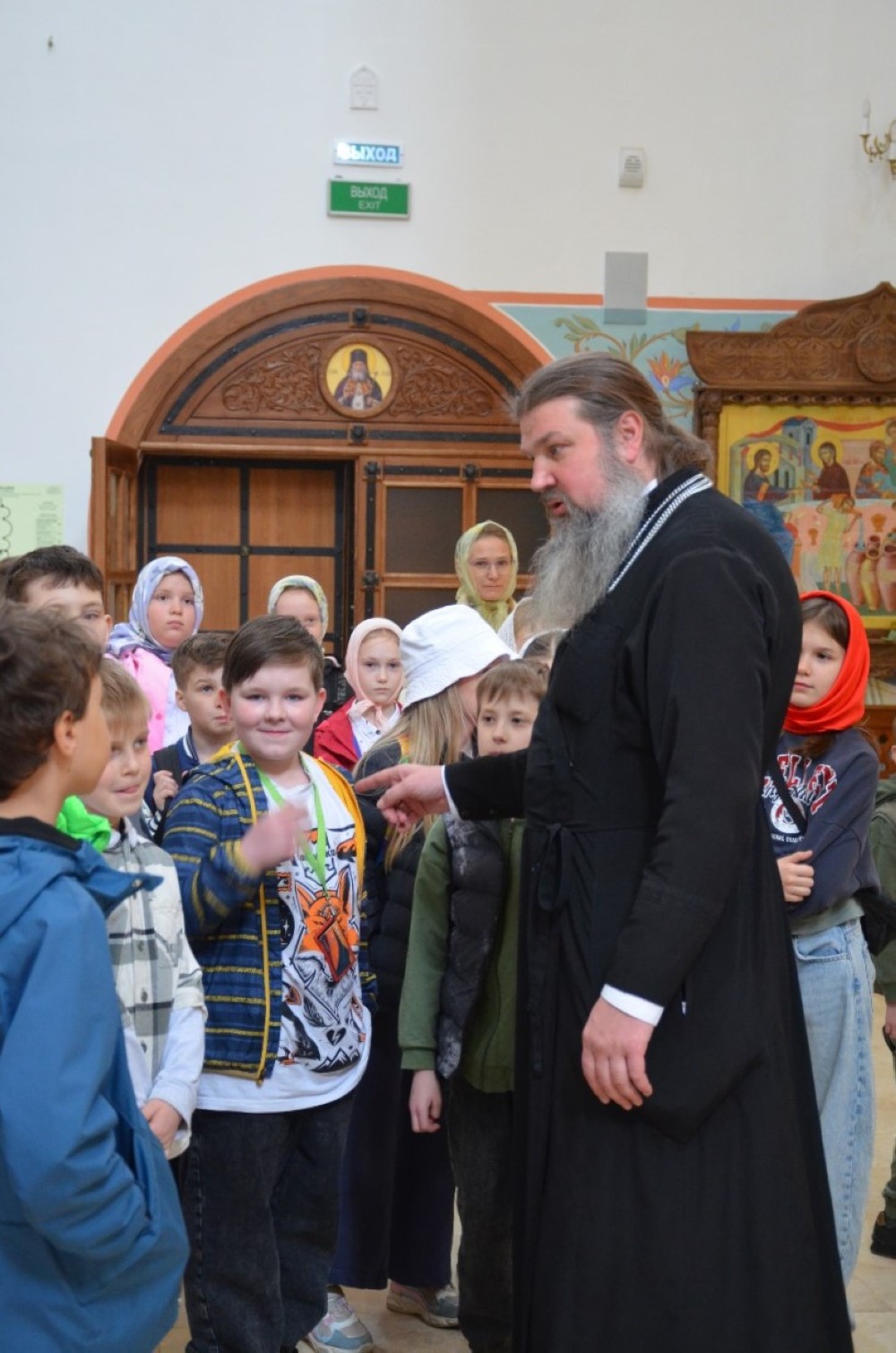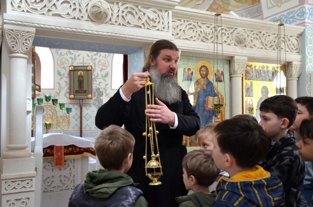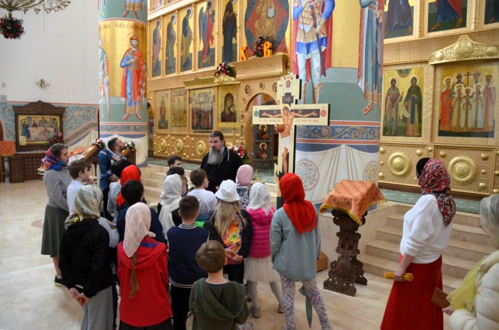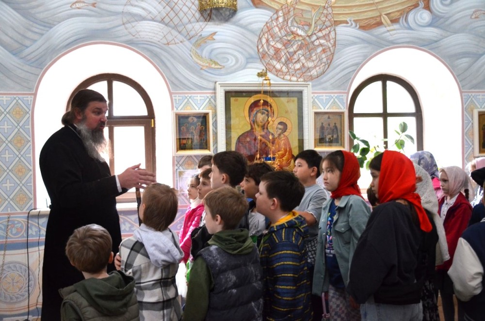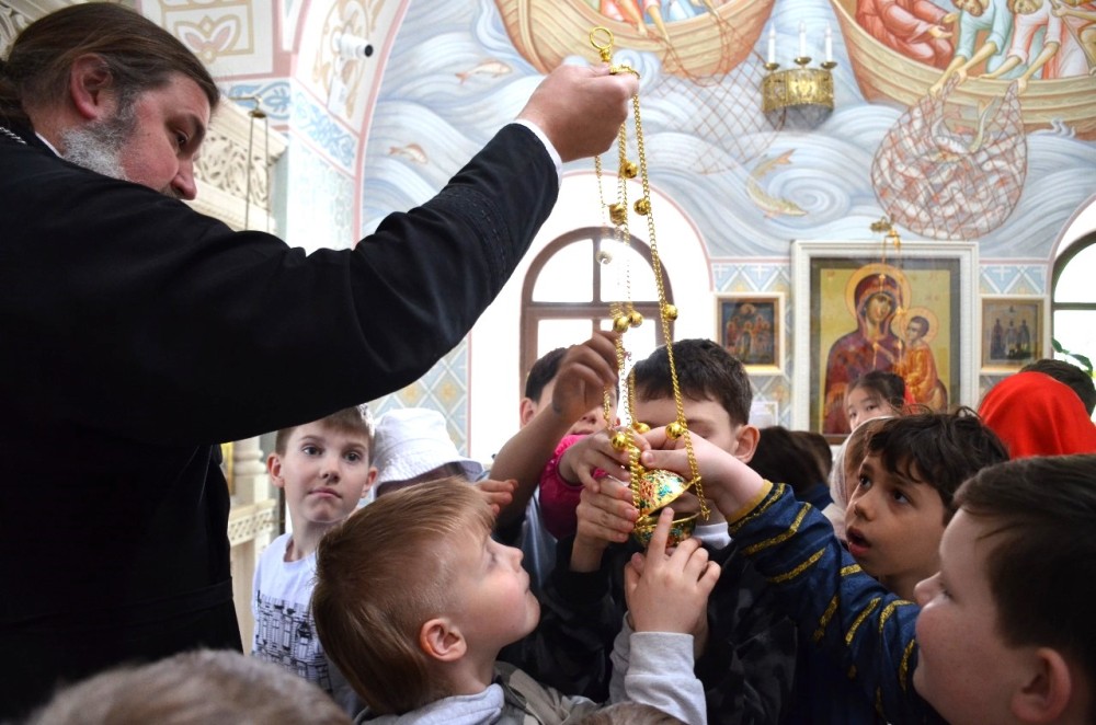 Дети полюбовались храмовыми росписями и послушали интереснейшую экскурсию об устройстве храма и азах православной веры. А многие впервые услышали незнакомое слово Катапетасма и узнали, что оно означает (завеса Царских врат в православных храмах), подержали в руках игуменский посох, изучили и потрогали кадило, рассмотрели подробно Распятие и узнали, что обозначают буквы на нем, а также какие символы изображены на Распятии.