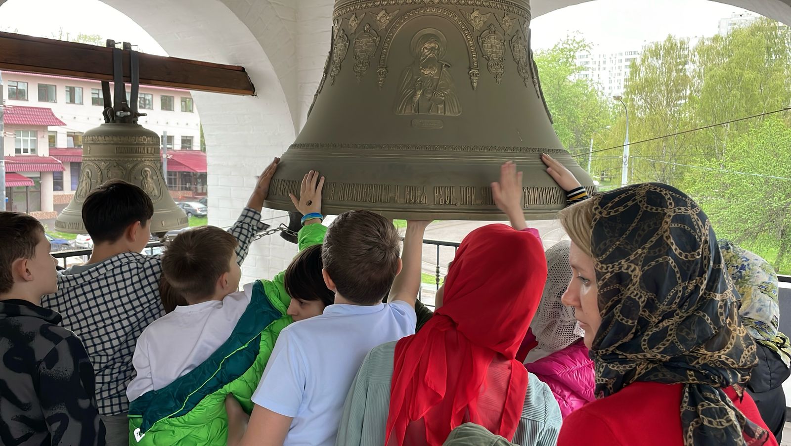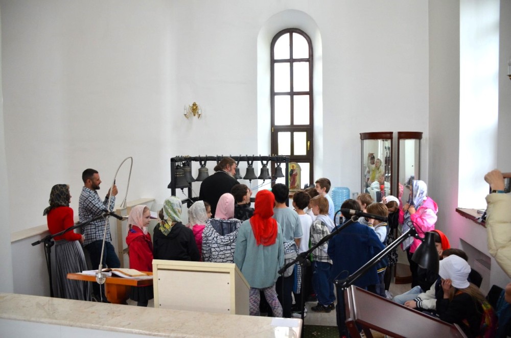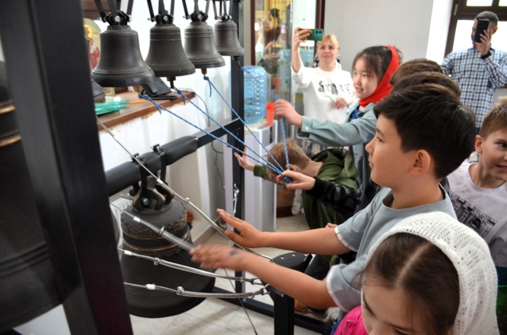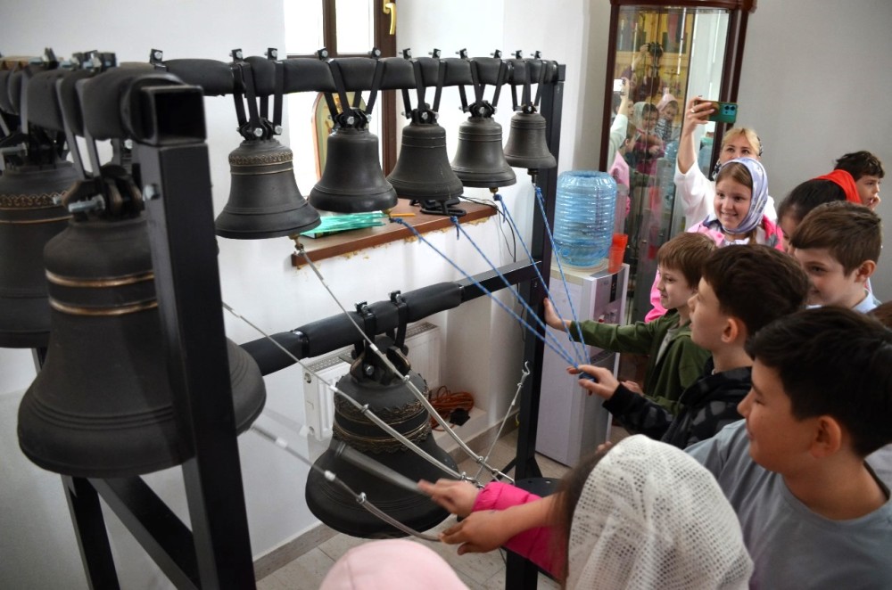 Большим сюрпризом для всех стал небольшой мастер-класс по колокольному звону на учебной звоннице, которая находится на клиросе с прекрасным обзором всего внутреннего убранства храма. А самый главный сюрприз всех ждал на звоннице храма, которая расположена рядом с основным храмом, где можно было ударить в самый большой колокол, полюбоваться панорамой, открывающейся сверху и сделать общее фото.