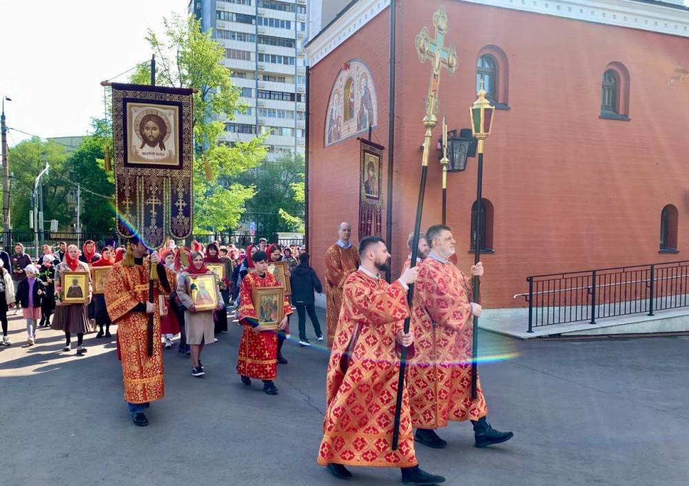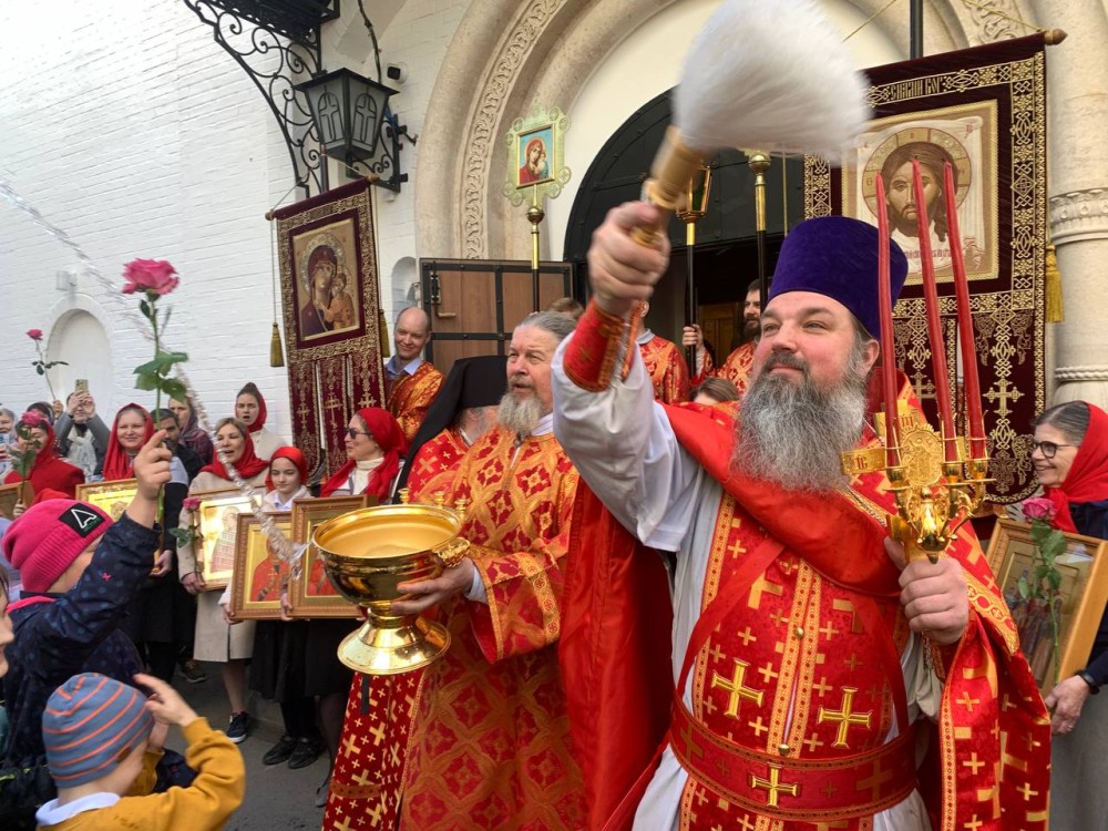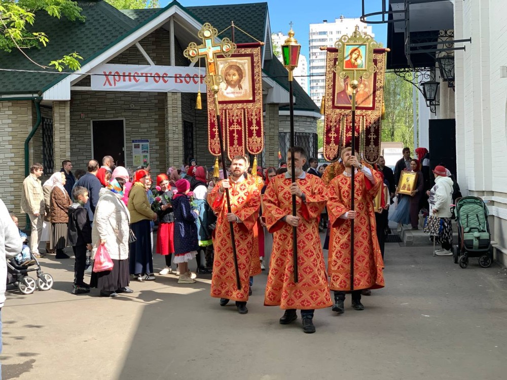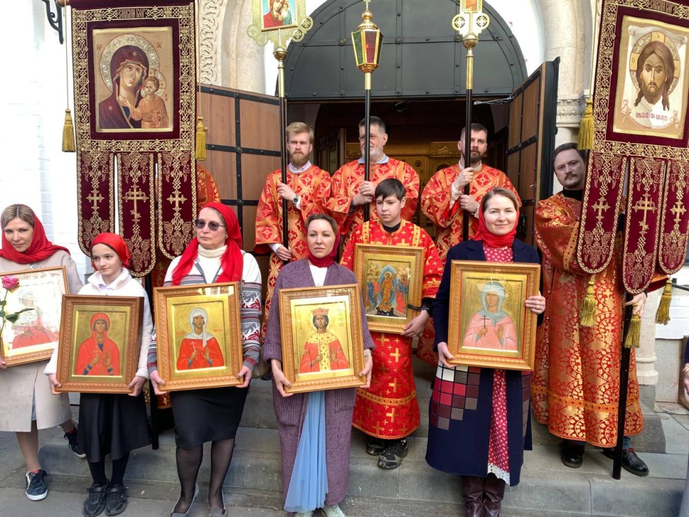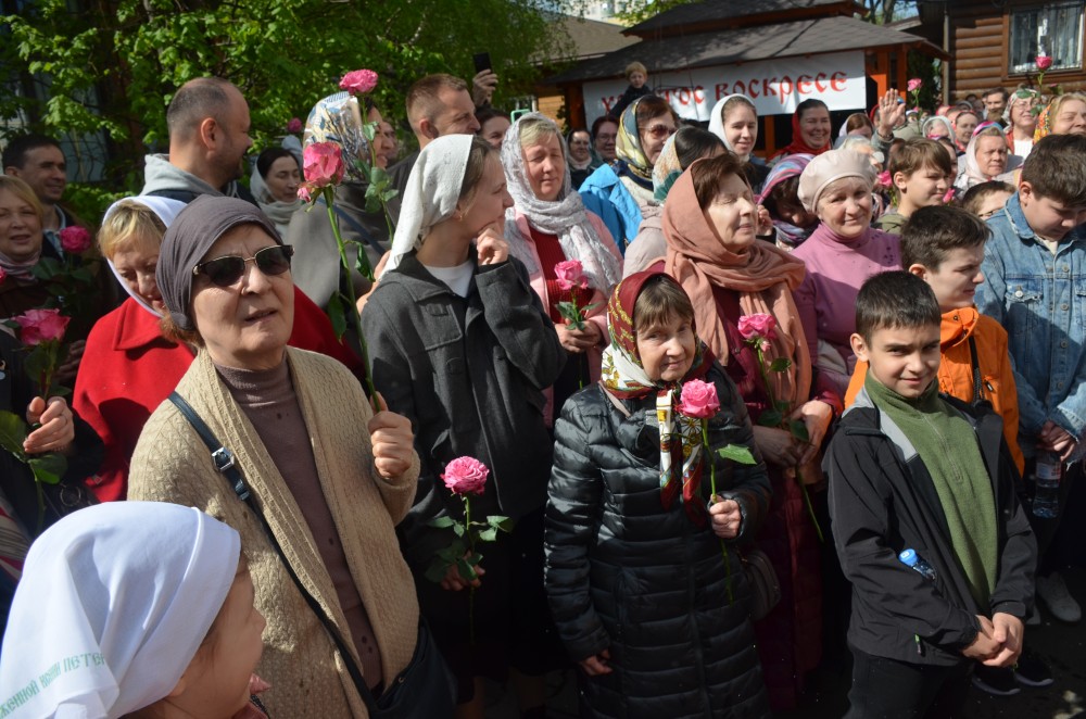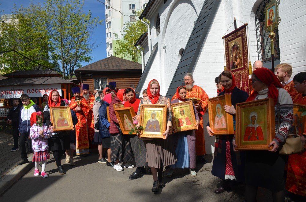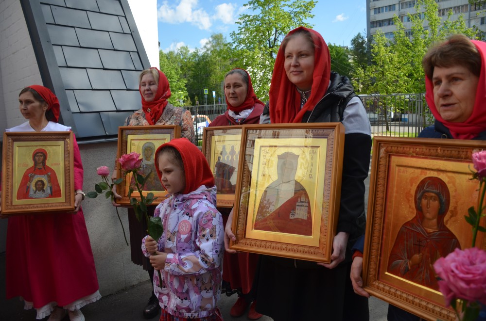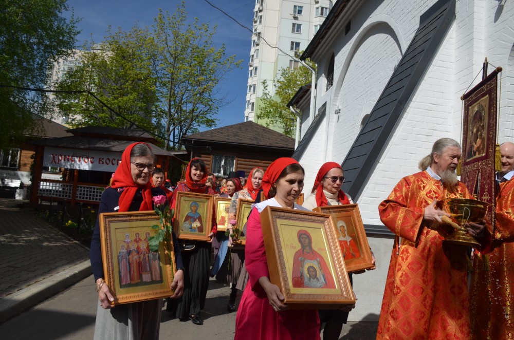 В завершение состоялся торжественный Крестный ход с участием прихожанок храма, которые несли в руках цветы и иконы с ликами святых жен.