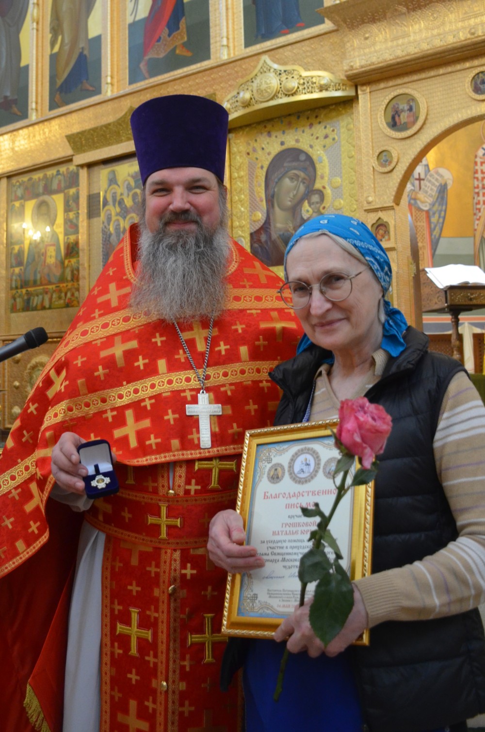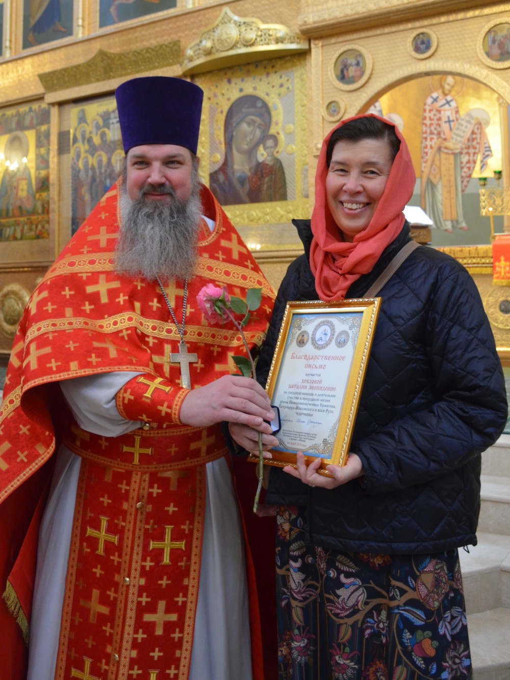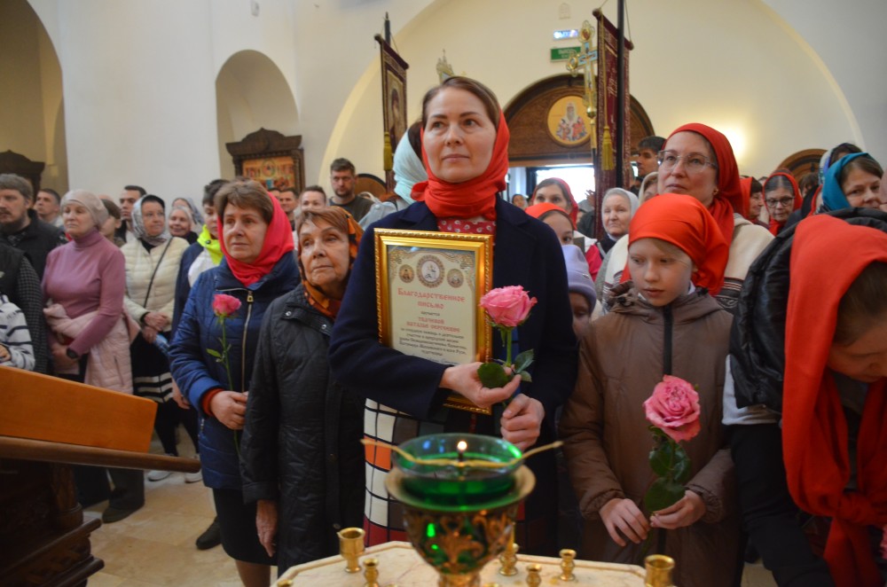 Затем иерей Иоанн обратился к прихожанам с проповедью, в которой отметил особое значение женщины в деле служения Церкви. Особенно настоятель отметил заслуги некоторых сотрудниц и прихожанок храма - поблагодарил за труды и неоценимый вклад в жизнь прихода и на благо Церкви и вручил памятные значки и благодарственные письма. Далее настоятель поздравил всех пришедших женщин с праздником, после чего состоялось вручение цветов - по доброй традиции специально к празднику для всей женской части прихода были подготовлены прекрасные благоухающие розы.