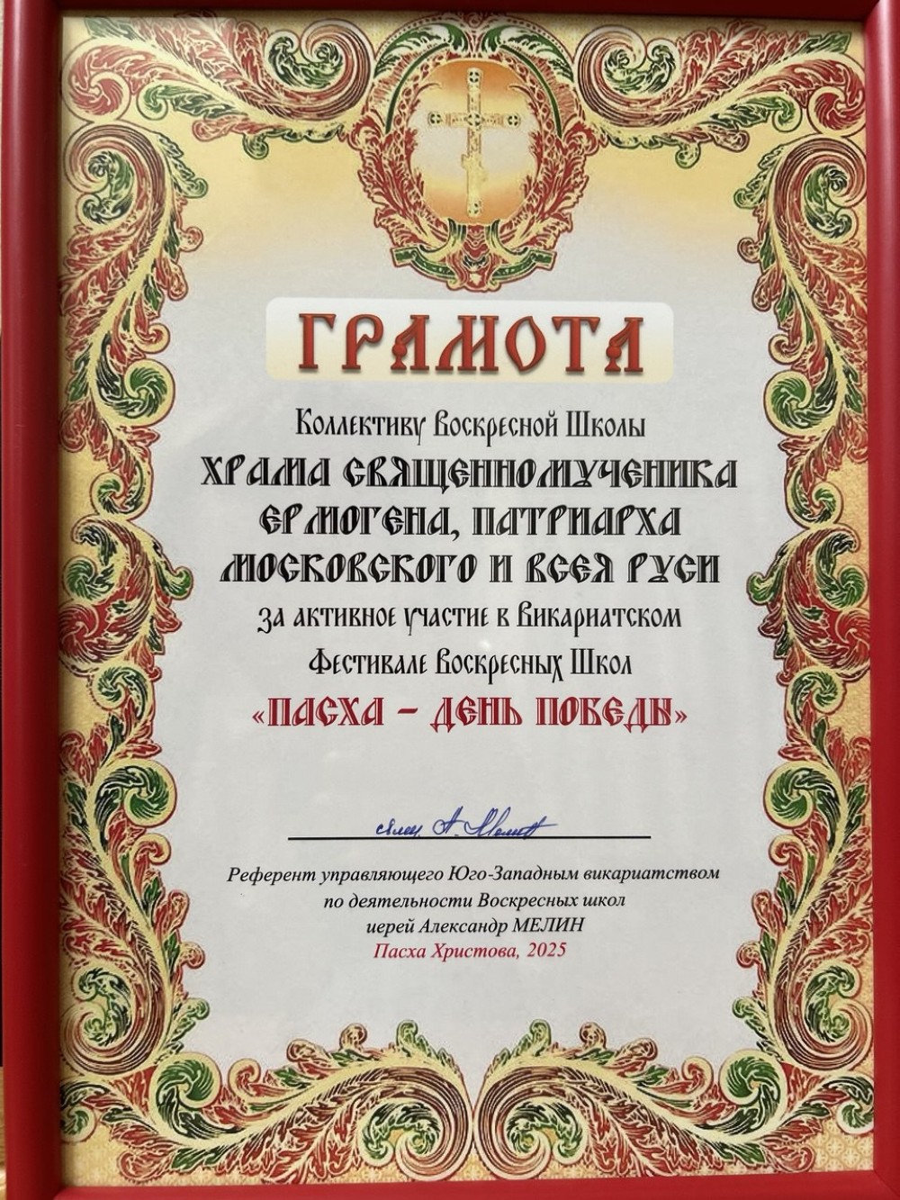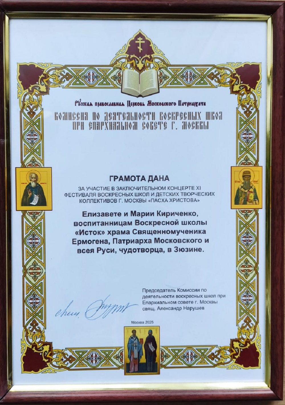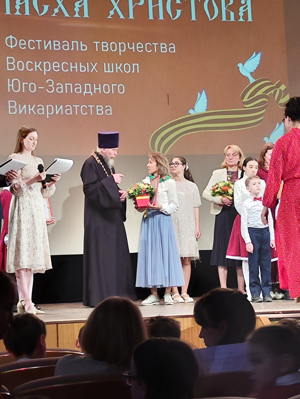 17 мая Воскресная школа "Исток" храма Священномученика Ермогена, Патриарха Московского и всея Руси, чудотворца, в Зюзине, приняла участие в Пасхальном фестивале творческих коллективов Воскресных школ Юго-Западного Викариатства «Пасха - День Победы», который состоялся в здании Префектуры ЮЗАО г.Москвы.