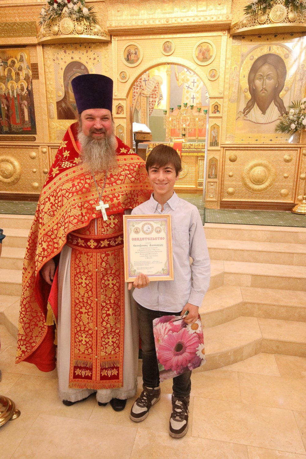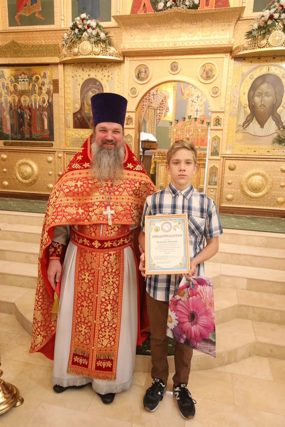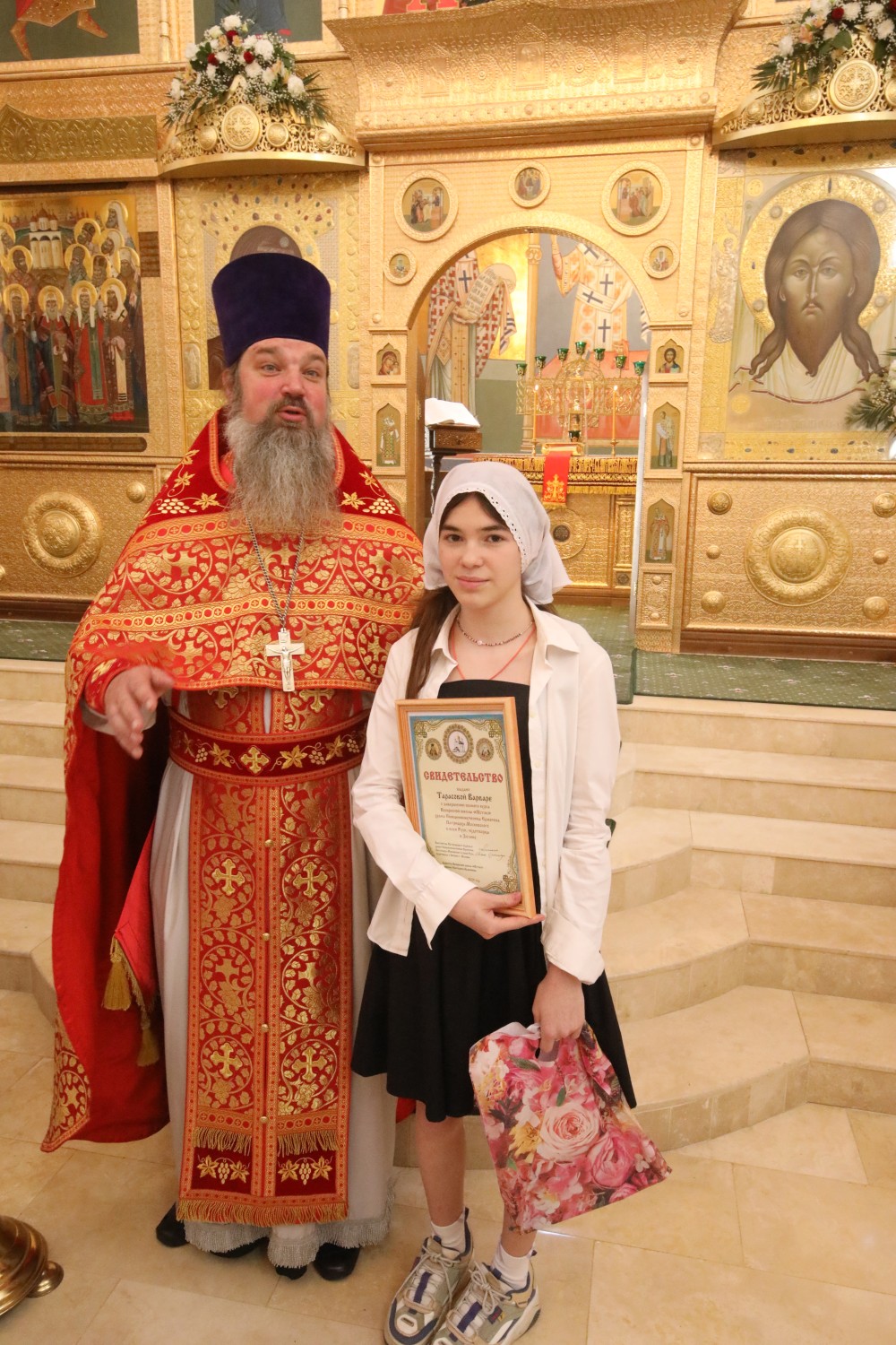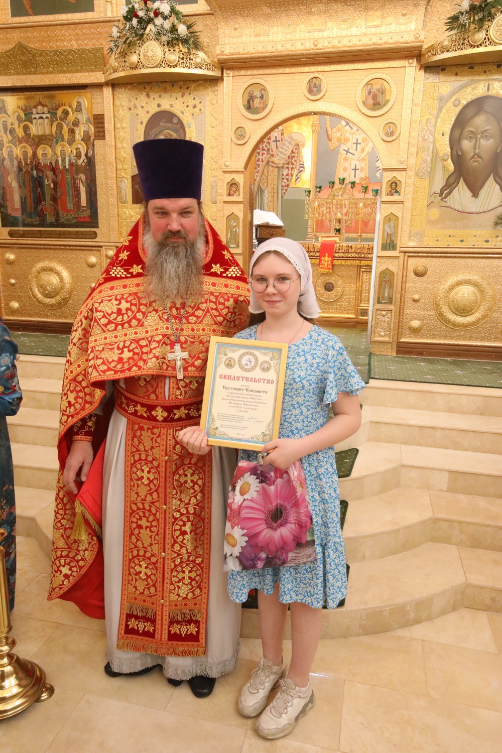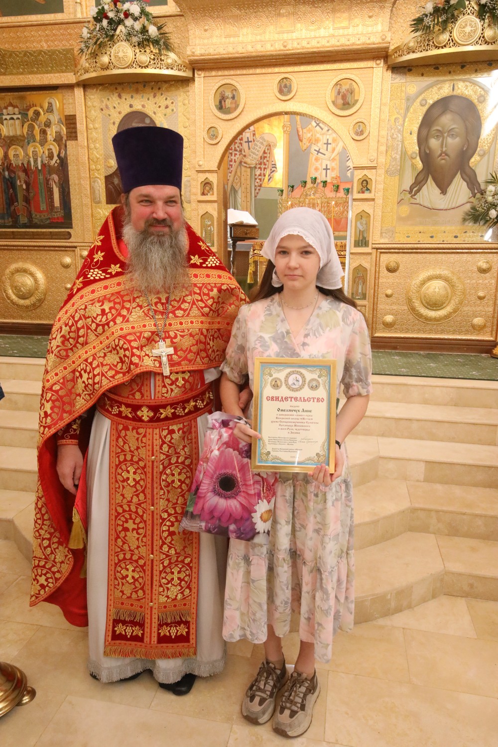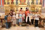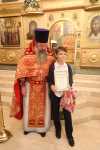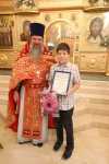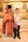 Затем состоялось поздравление выпускников старшей группы "Росток" Воскресной школы "Исток" и именинников, родившихся в этот день. Настоятель храма иерей Иоанн Омелянчук и директор Воскресной школы Екатерина Вадимовна Гришина вручили выпускникам свидетельства о прохождении и об окончании курса обучения и памятные подарки.