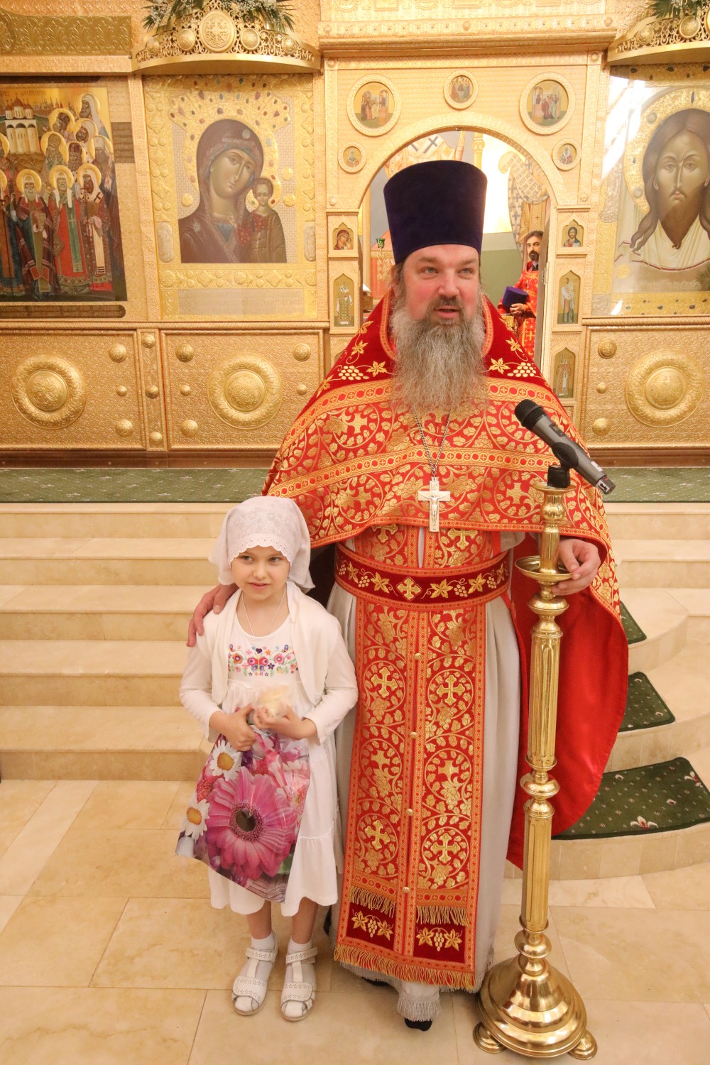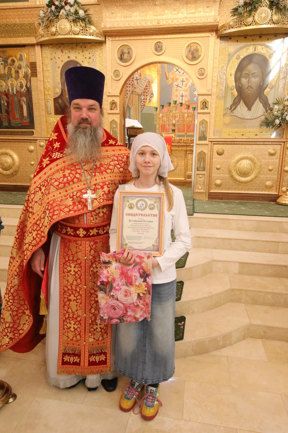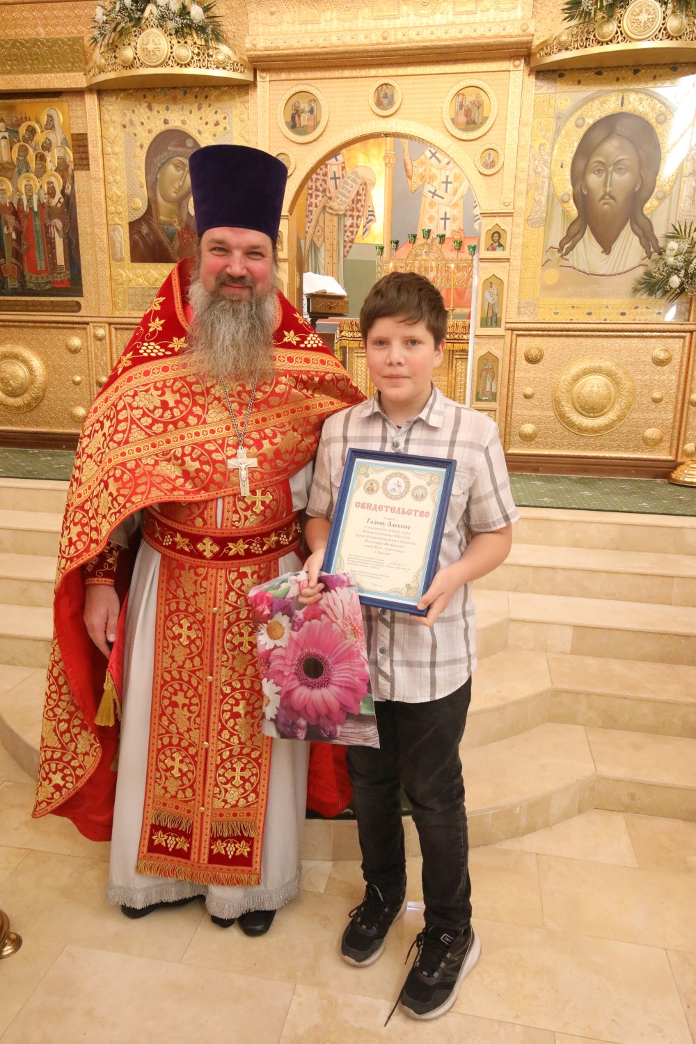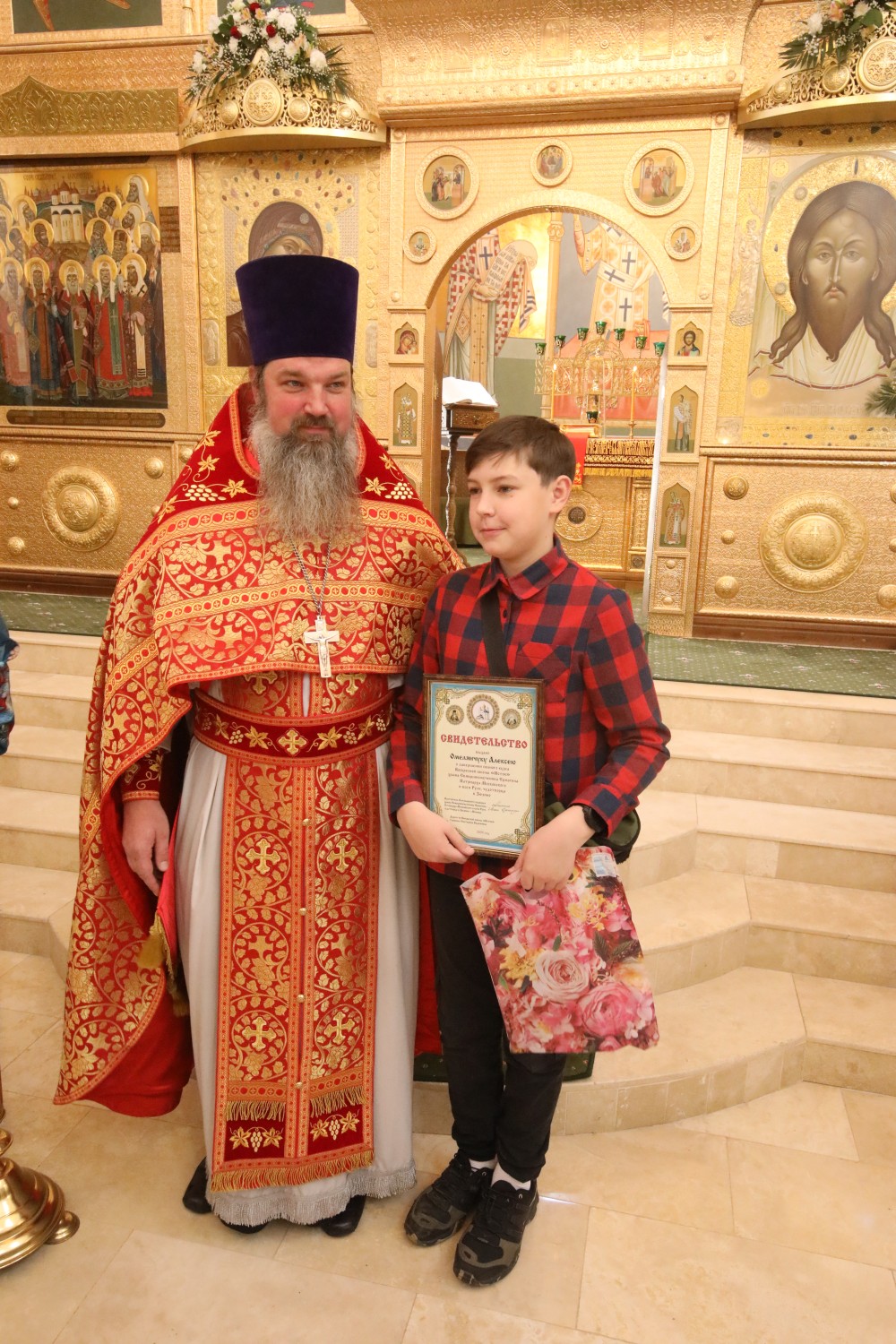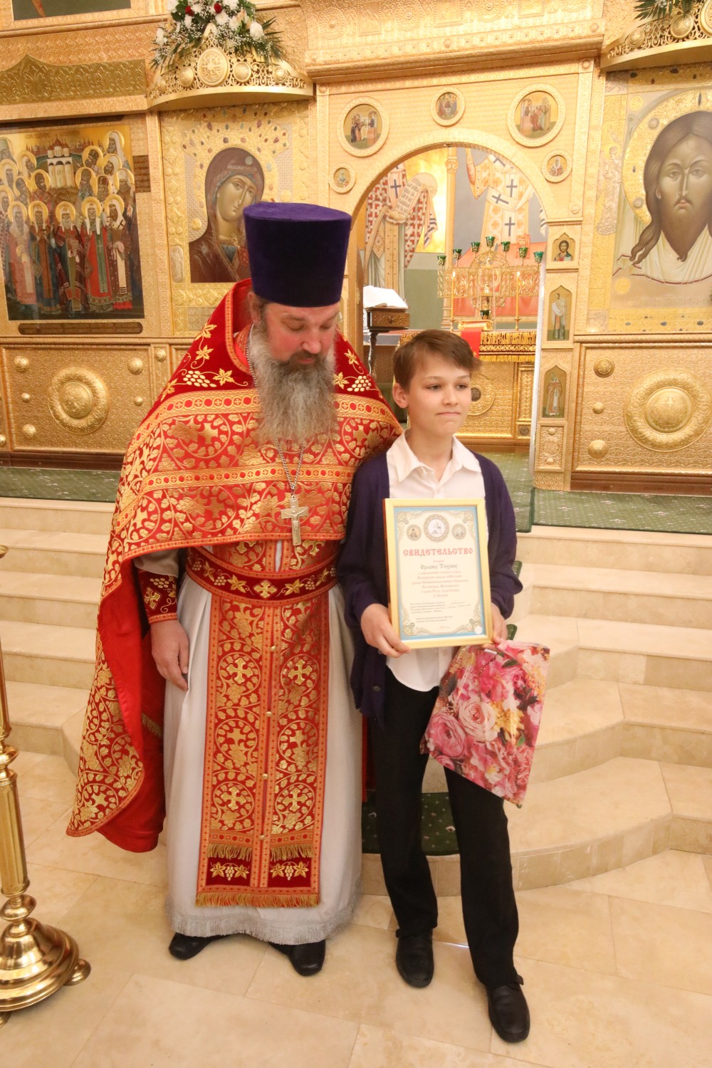 Затем состоялось поздравление выпускников старшей группы "Росток" Воскресной школы "Исток" и именинников, родившихся в этот день. Настоятель храма иерей Иоанн Омелянчук и директор Воскресной школы Екатерина Вадимовна Гришина вручили выпускникам свидетельства о прохождении и об окончании курса обучения и памятные подарки.