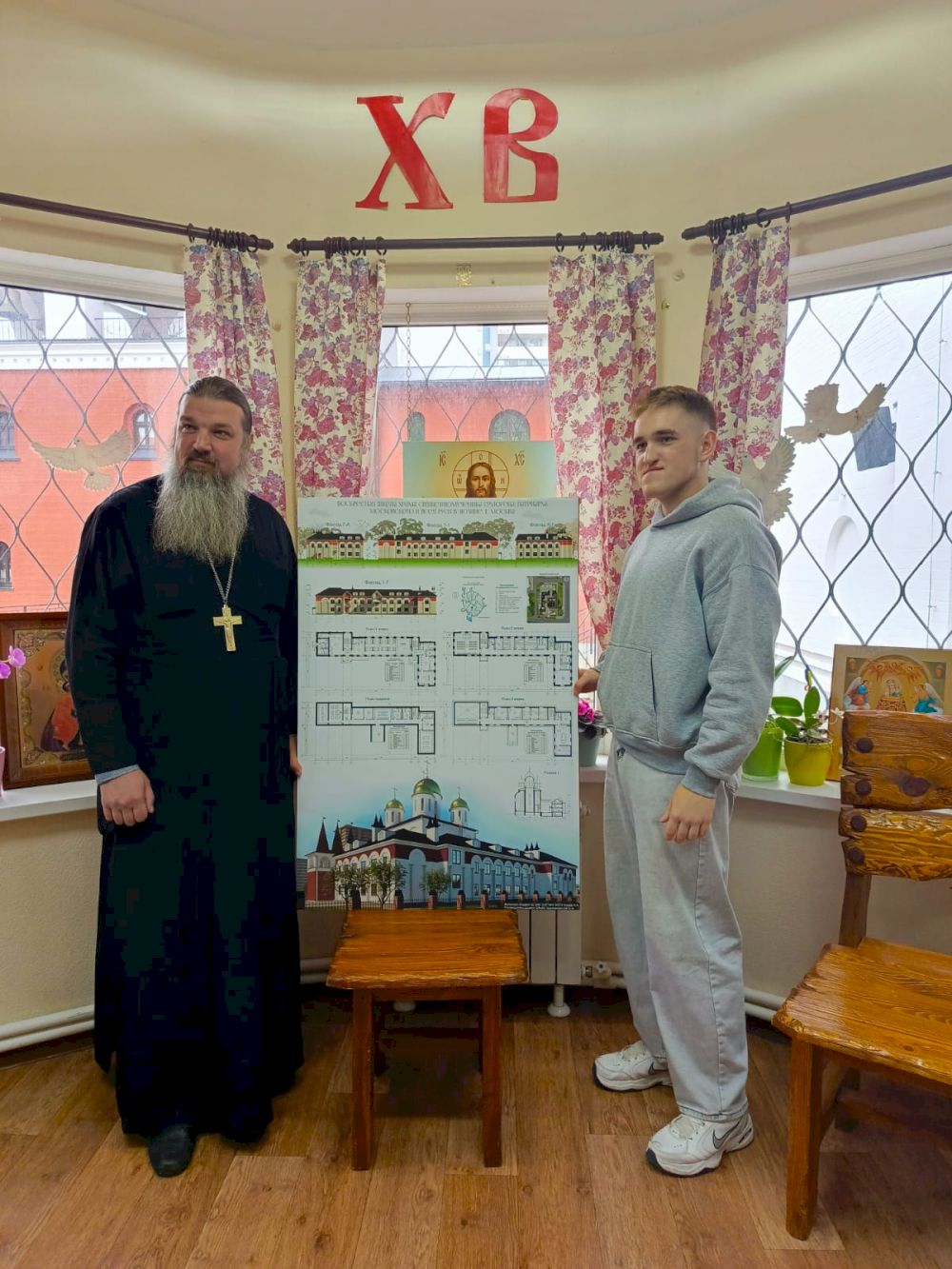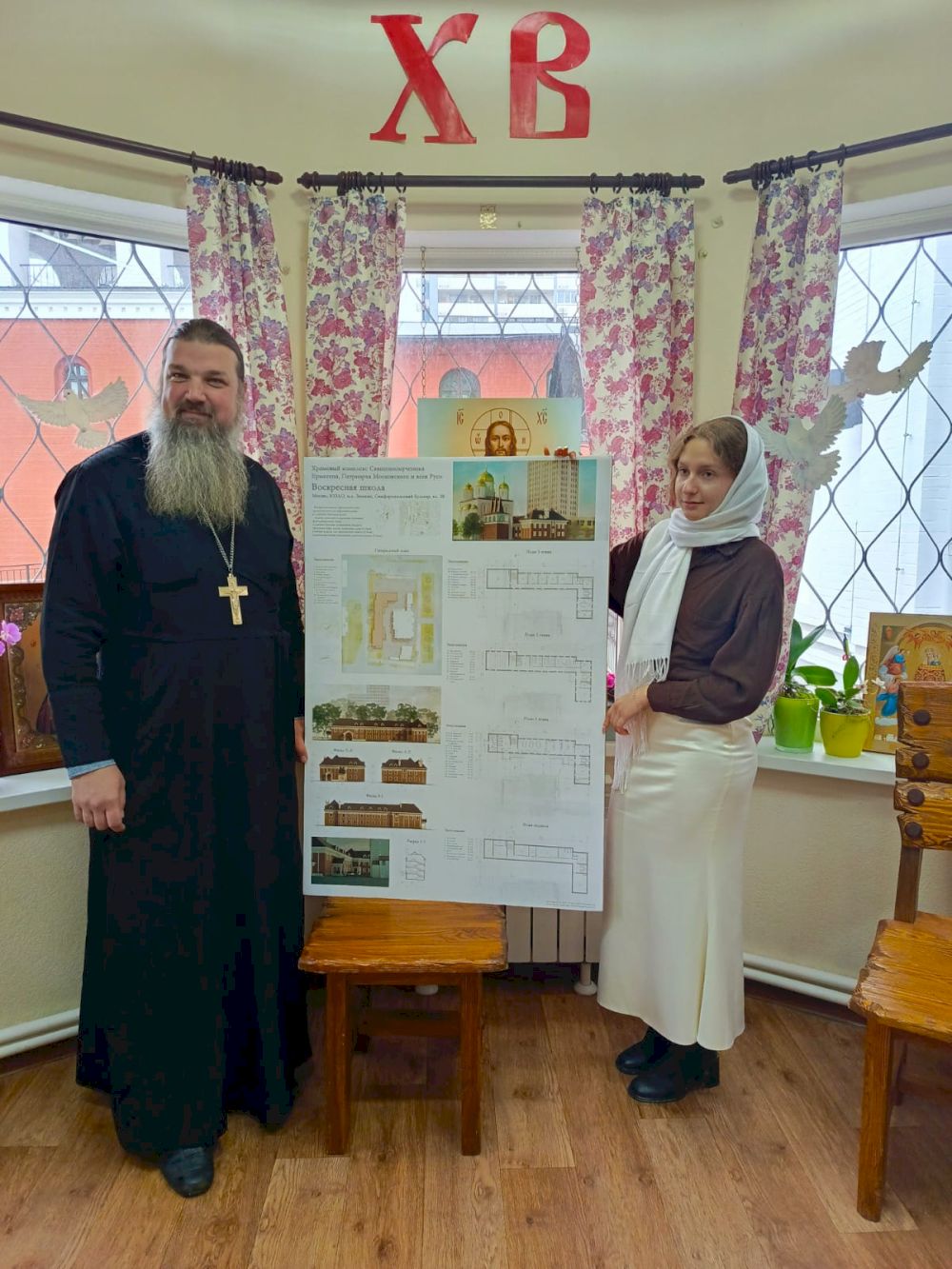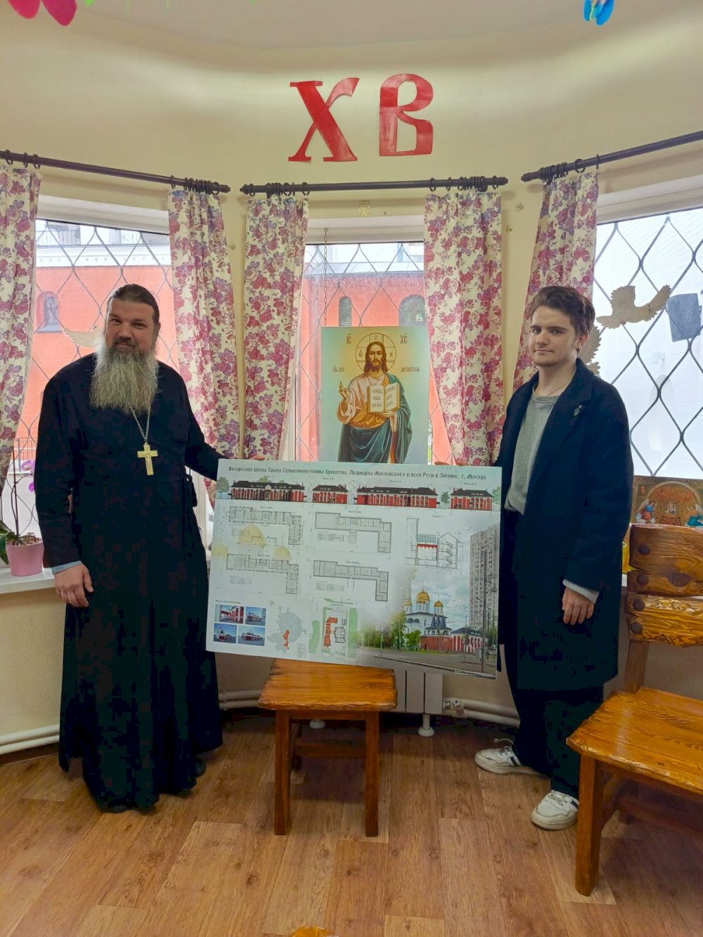 Студенты 2 курса направления "Архитектура" Руслан Зонов-Гостев, Никита Карев и Алина Бережная под руководством доцента кафедры Основ архитектуры и художественных коммуникаций Крыжановской О. А. - прихожанки храма, выполнили эскизные проекты здания Воскресной школы, которое планируется построить на территории храмового комплекса.