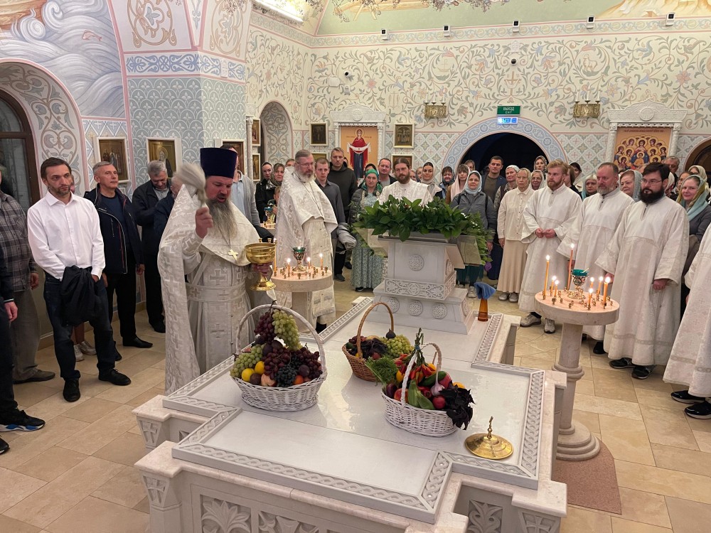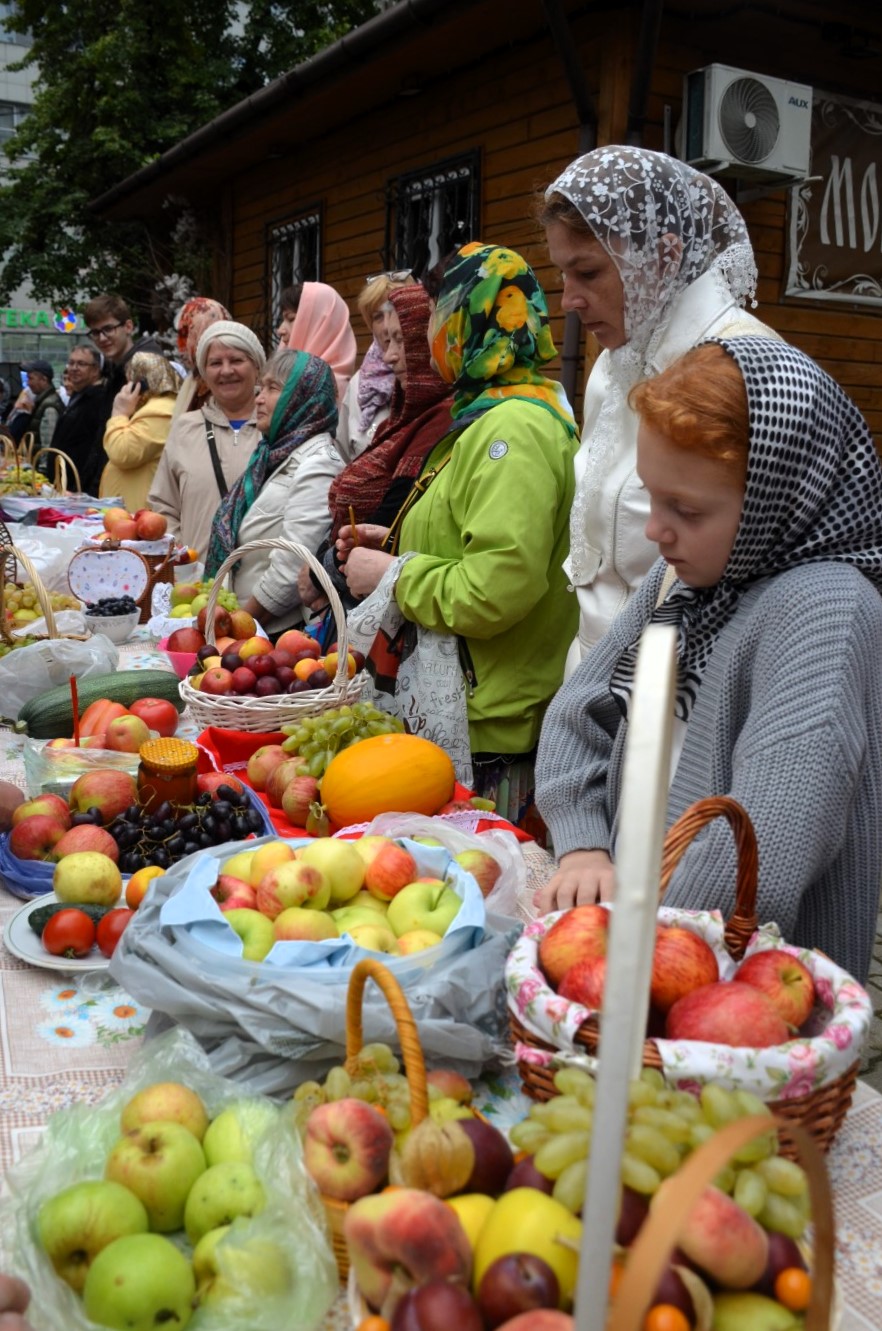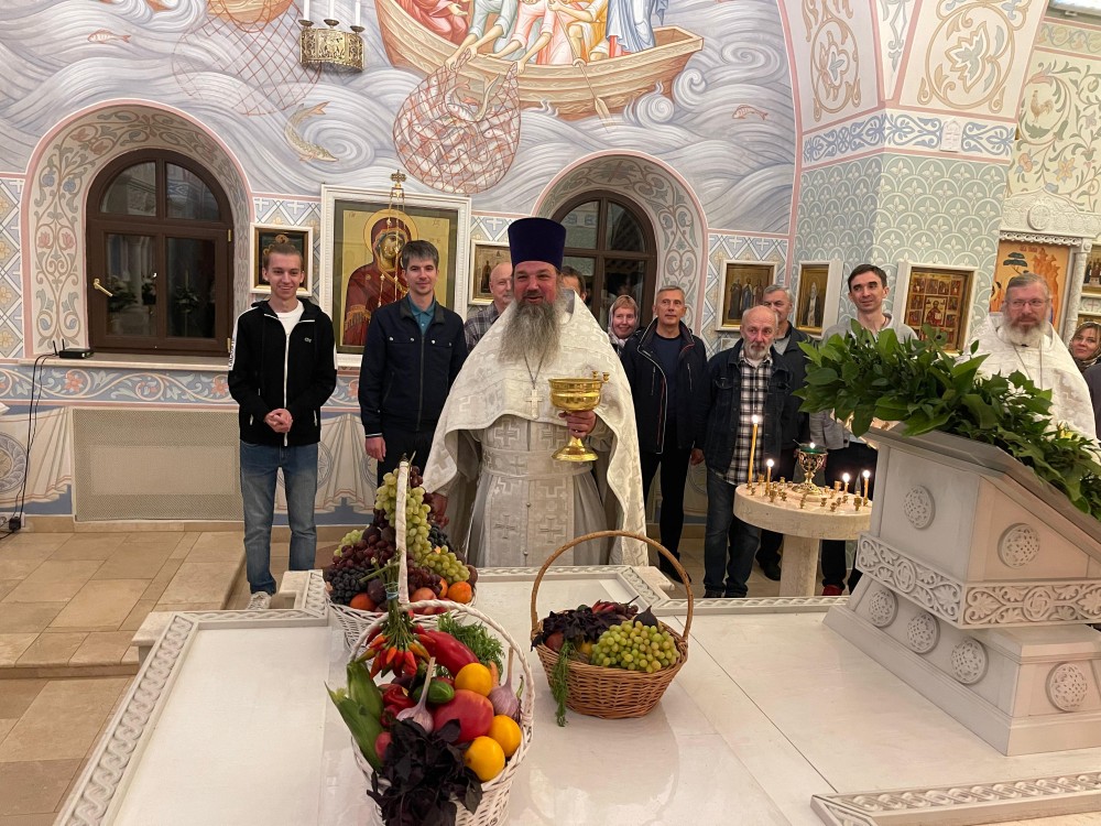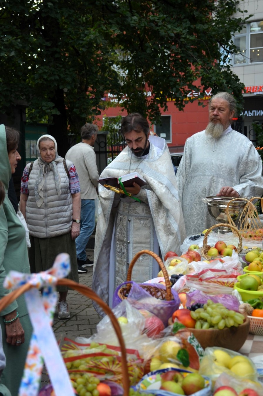По окончании поздней Божественной Литургии на прихрамовой территории состоялось освящение принесенных плодов, ягод и фруктов, которые православные по традиции приносят в этот день, называемый в народе "Яблочный спас", для приобщения благодати Божией и благословения полученного урожая.