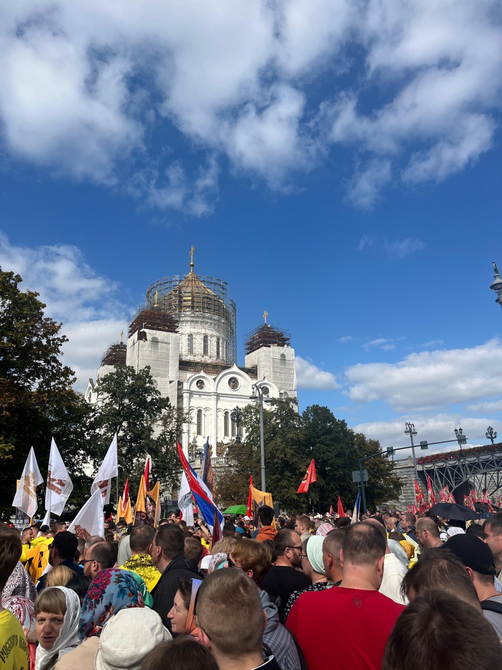 Десятки тысяч православных москвичей приняли участие в общегородском крестном ходе от кафедрального соборного Храма Христа Спасителя до Новодевичьего ставропигиального монастыря во главе со Святейшим Патриархом Московским и всея Руси Кириллом. (https://moseparh.ru/predstoyatel-russkoj-cerkvi-vozglavil-obshhemoskovskij-krestnyj-xod.html)