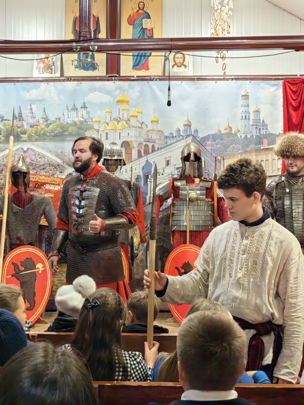 Дети и взрослые с увлечением и вниманием слушали рассказ «богатыря» об истории средневековой Руси, о благословении Дмитрия Донского преподобным Сергием Радонежским и ратных подвигах монахов Александра Пересвета и Андрея Осляби. Рассказ сопровождался вопросами и видео фрагментами.