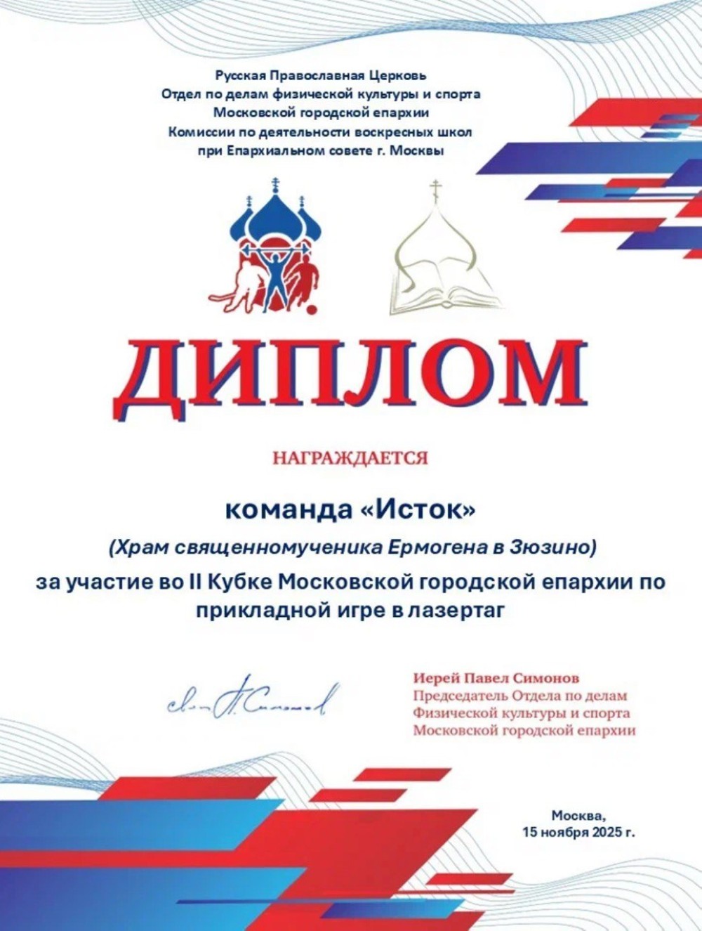 15 ноября команда старших учащихся Воскресной школы «Исток» храма Священномученика Ермогена, Патриарха Московского и всея Руси, чудотворца, в Зюзине, приняла участие в соревнованиях по спортивной игре лазертаг, которая состоялась в спортивно-образовательном комплексе «Академия Будущего».
