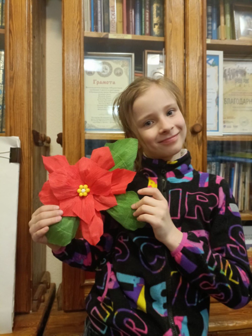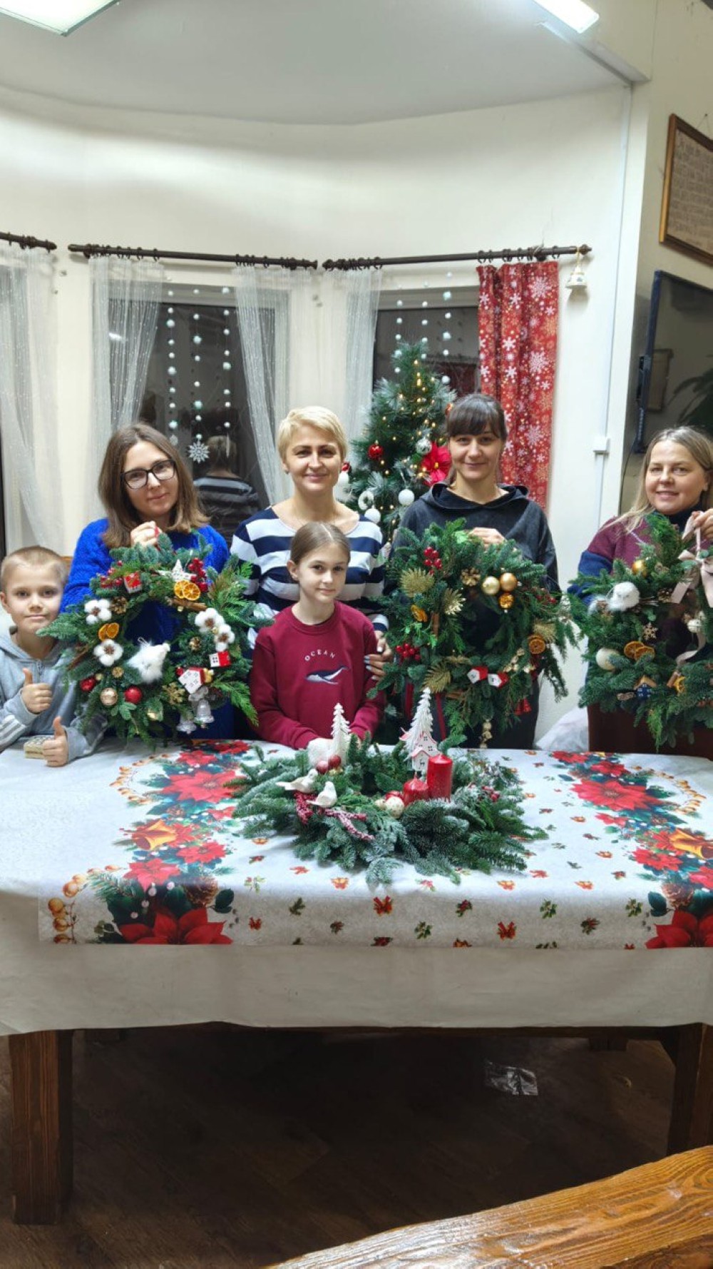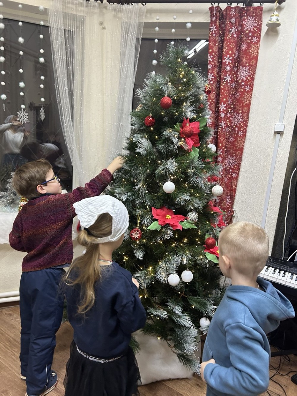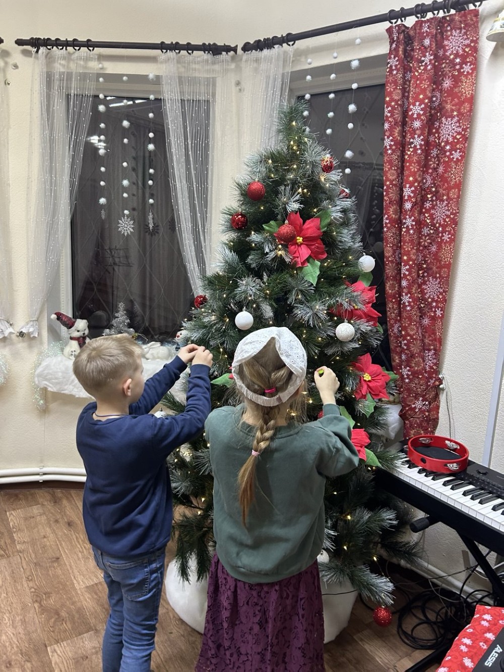На занятиях по рукоделию под руководством педагога Ольги Викторовны девочки смастерили из гофрированной бумаги цветы, которыми украсили ёлку, а младшие воспитанники украсили шариками и игрушками.