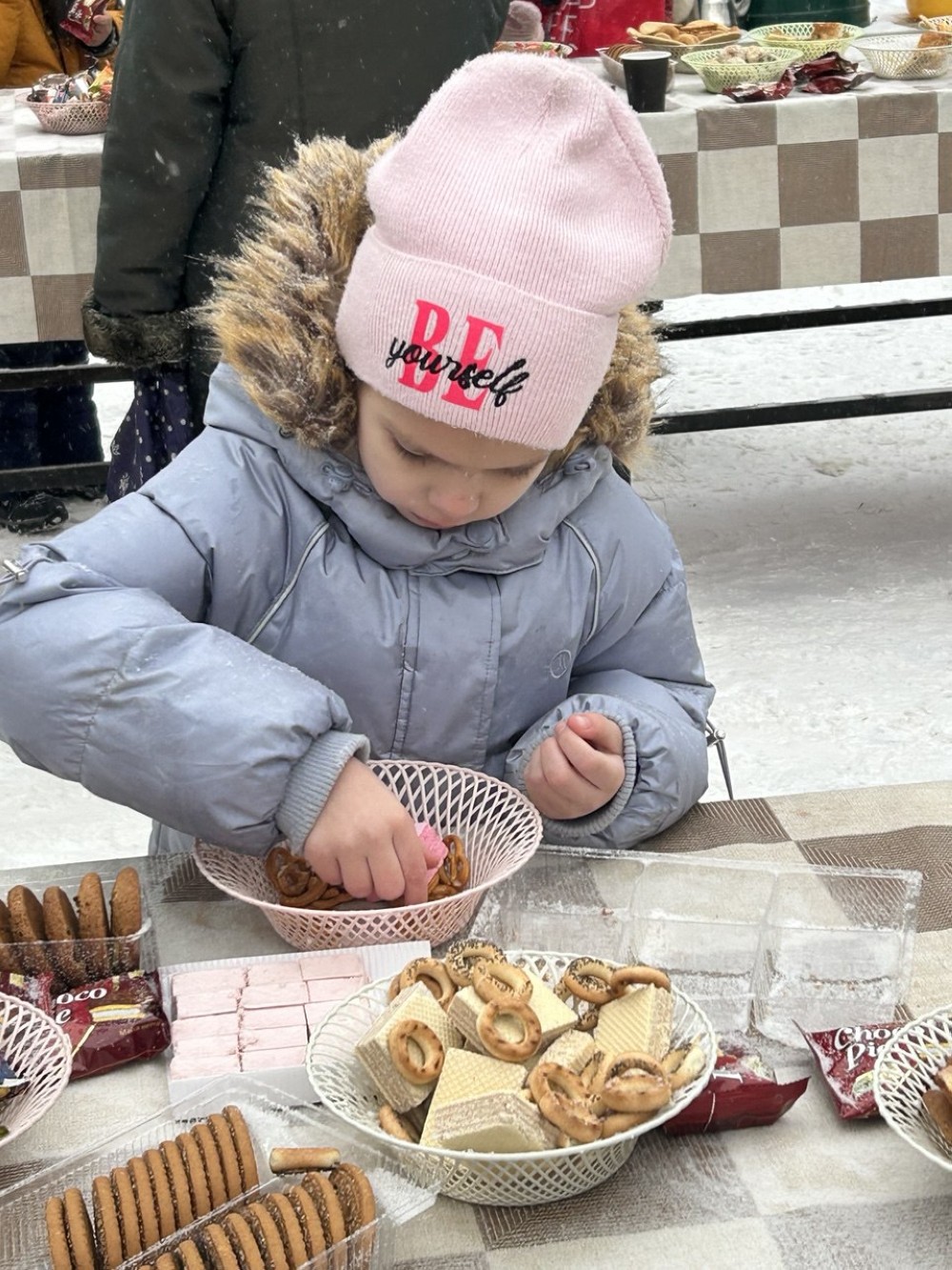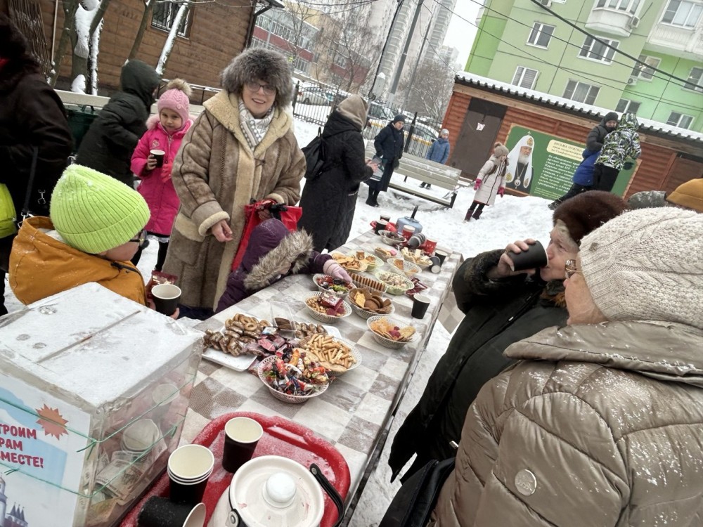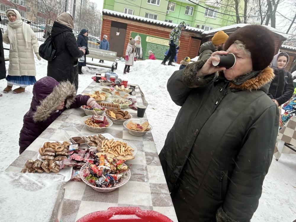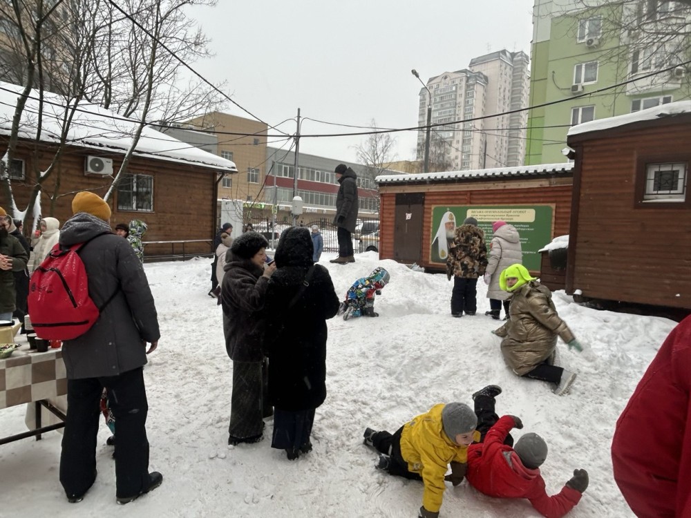 Чаепитие с горячими бутербродами, сладостями и пряниками продолжилось на улице. Дети смогли порезвиться, покататься с горки, а взрослые пообщались и поделились впечатлениями от праздничного концерта, в котором приняли участие все воспитанники Воскресной школы.