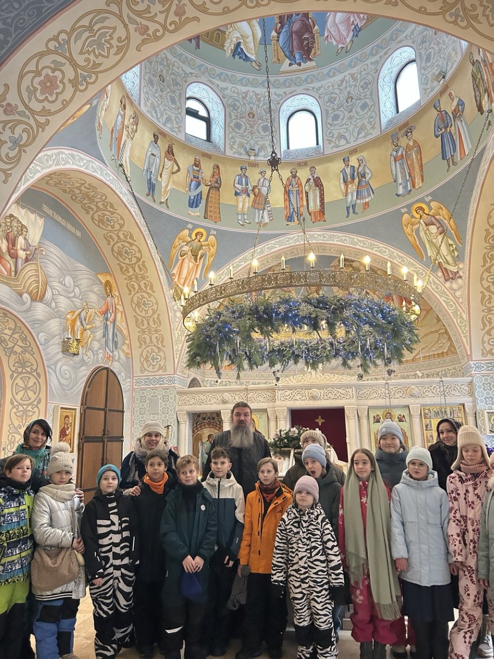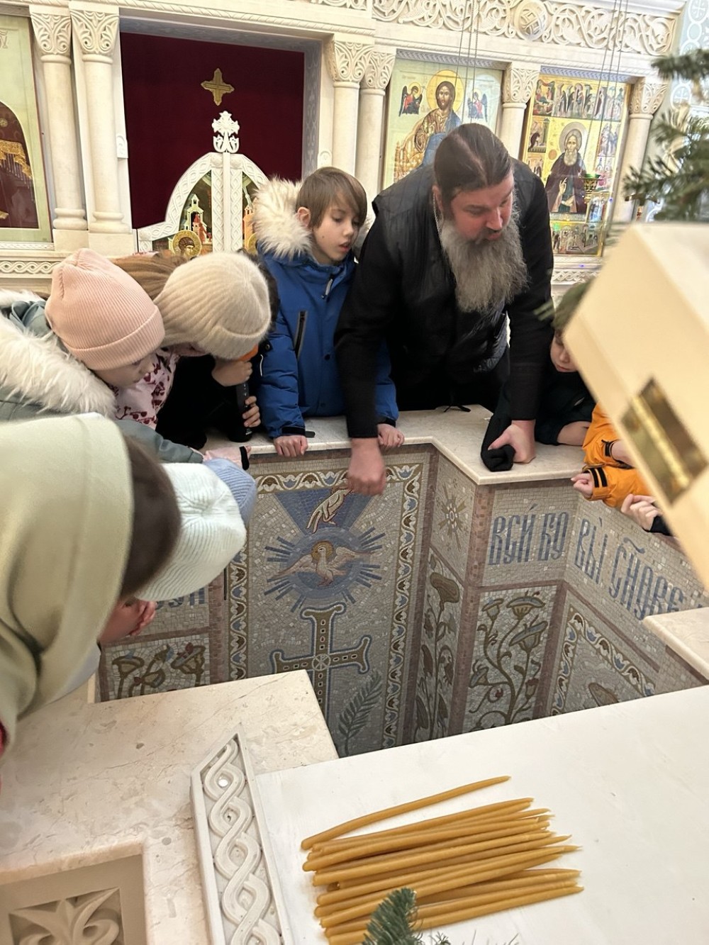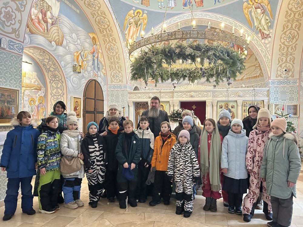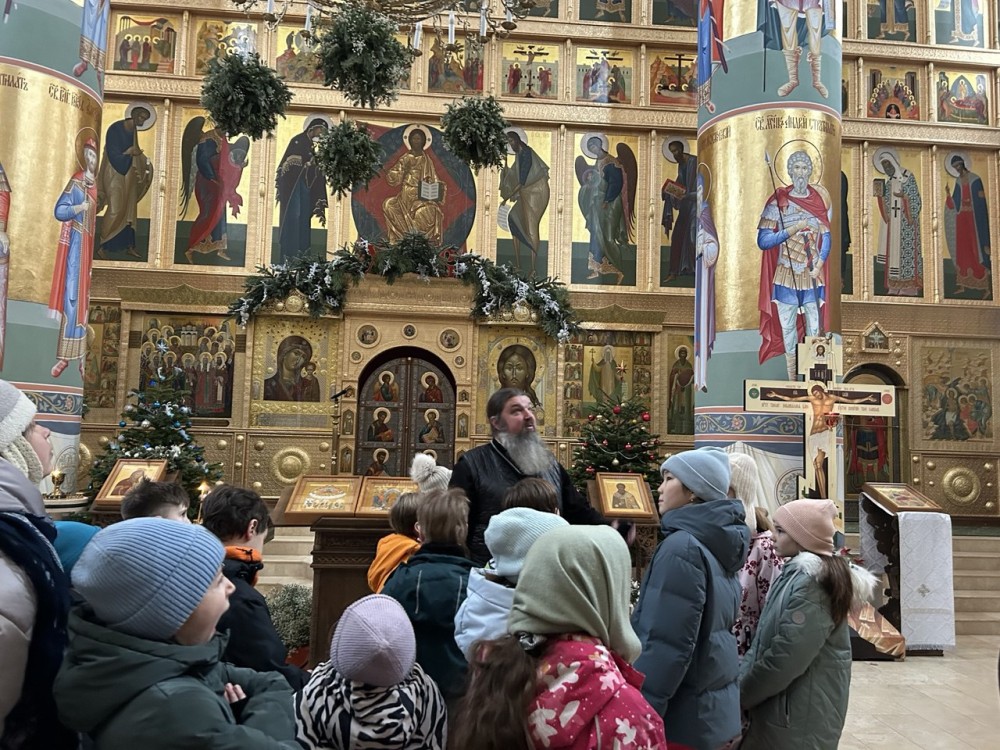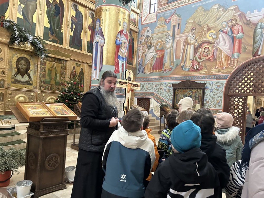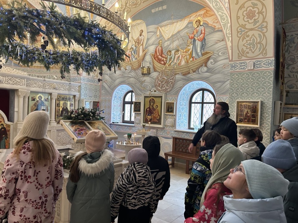 Иерей Иоанн рассказал историю Рождества Христова, затем дети осмотрели росписи и фрески крестильного придела в честь преподобного Сергия Радонежского, после чего в основном храме познакомились с историей жития Священномученика Ермогена.