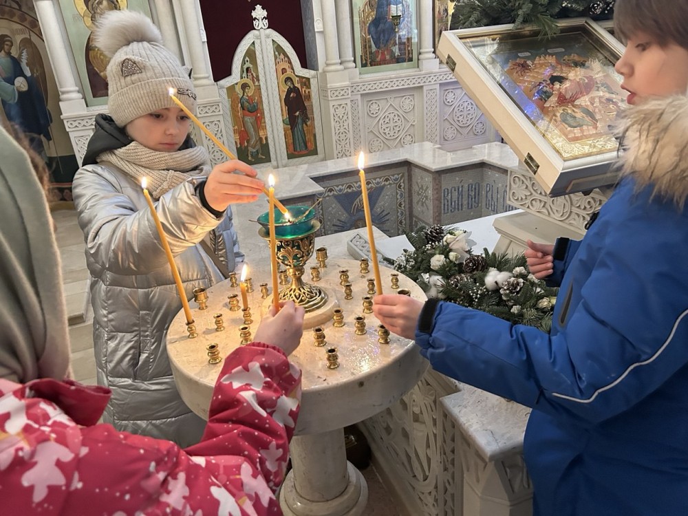 С период Святых дней Рождества Христова учащиеся приехали в храм и сразу поприветствовали всех встречающих пением Рождественских колядок, которые подготовили со своими педагогами.