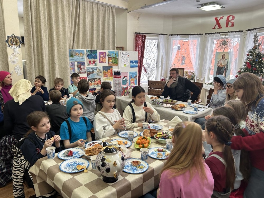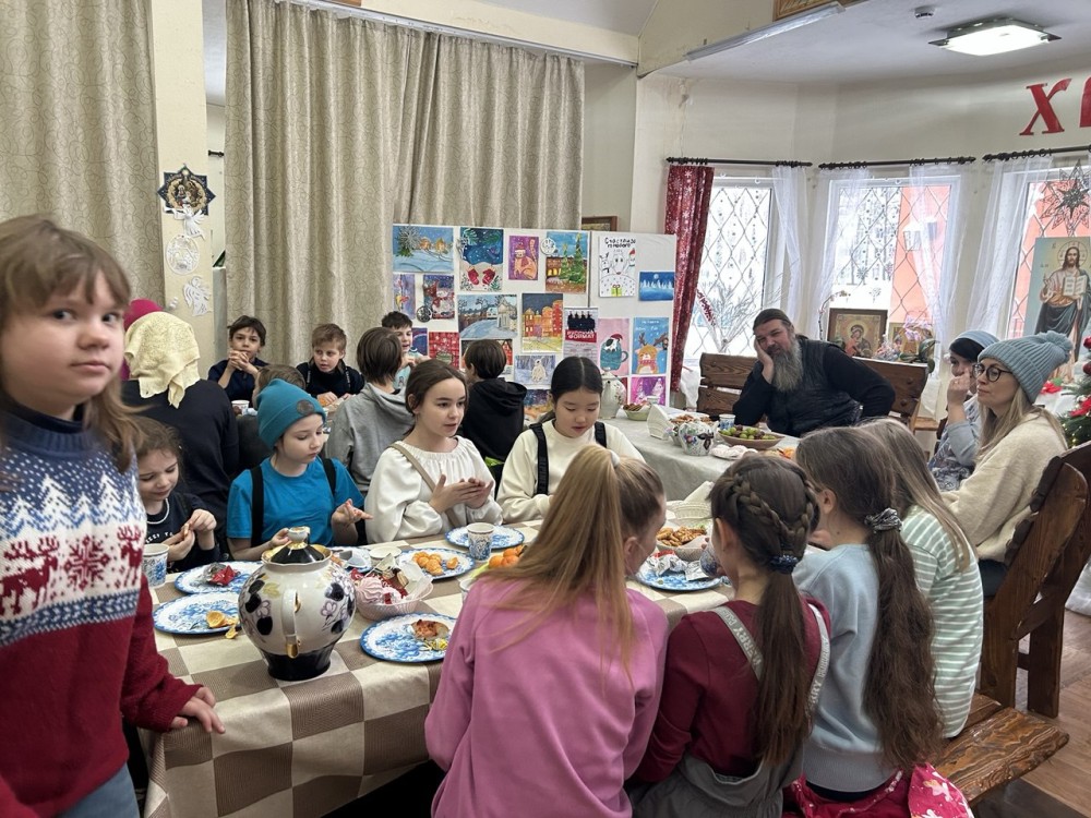 Завершилась встреча чаепитием в Воскресной школе, за трапезой дети подкрепились пирогами и сладким угощением, поделились впечатлениями и получили в подарок книги и сладости.