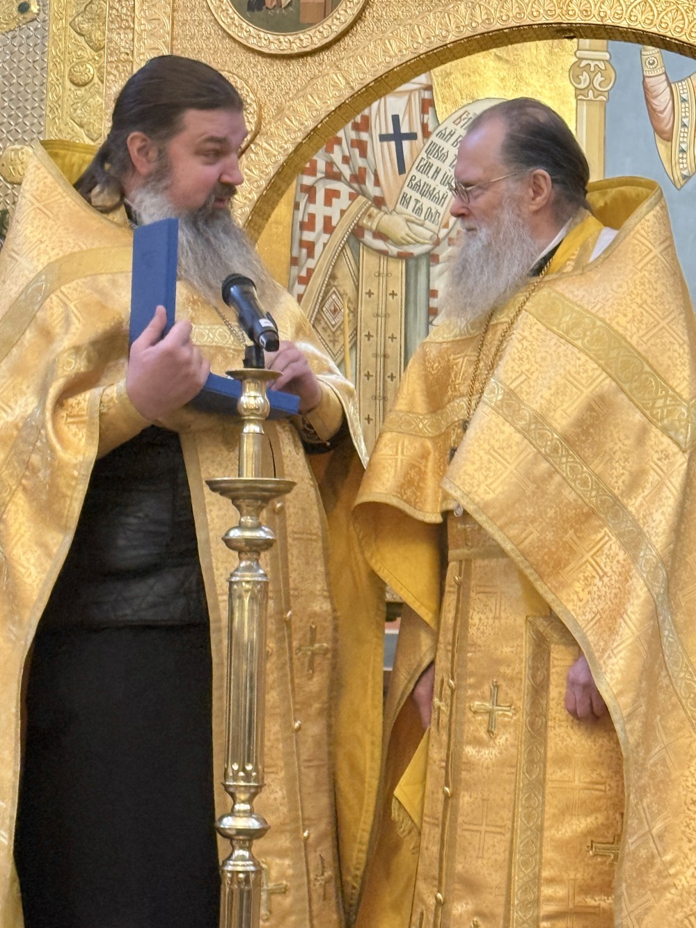 Затем, настоятель иерей Иоанн Омелянчук от духовенства храма и от всех прихожан поздравил игумена Серафима (Белла) с 75-летним юбилеем. Отец Иоанн отметил труды отца Серафима на благо Церкви и прихода и преподнес памятный подарок - крест с дарственной надписью.