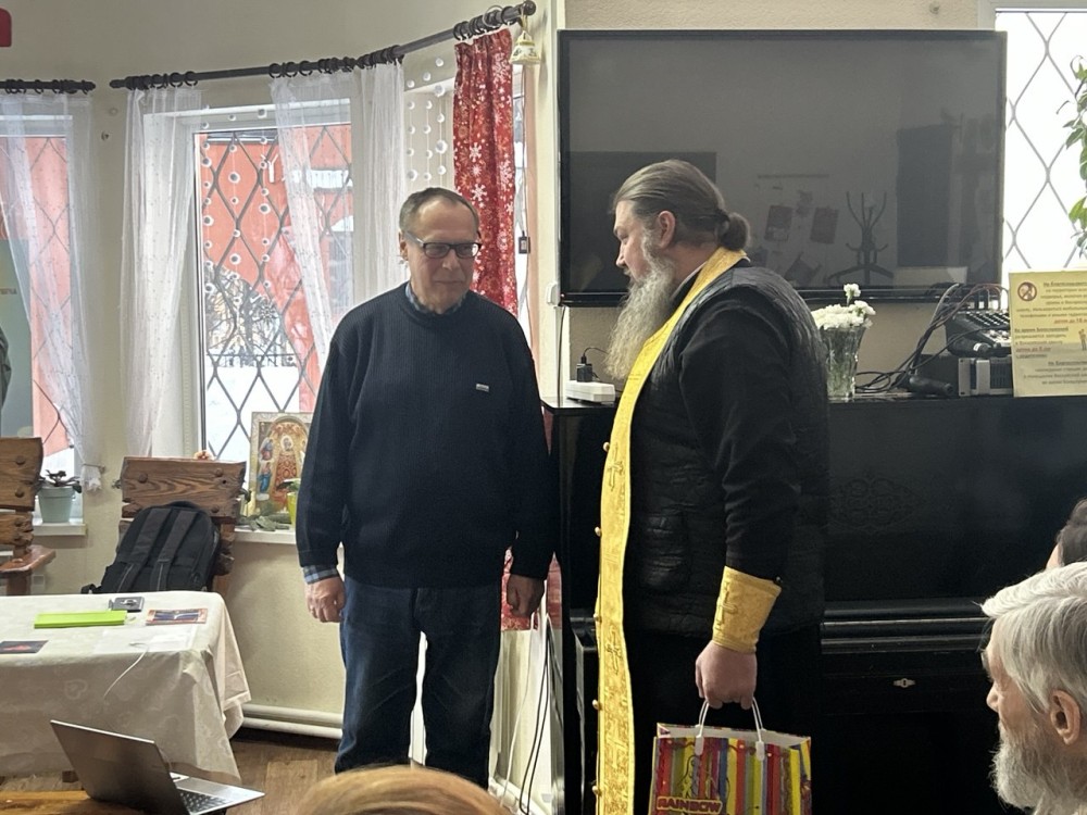 Настоятель храма иерей Иоанн Омелянчук поблагодарил Евгения Игоревича за труды и вручил памятную книгу о Патриархе Ермогене, небесном покровителе храма.