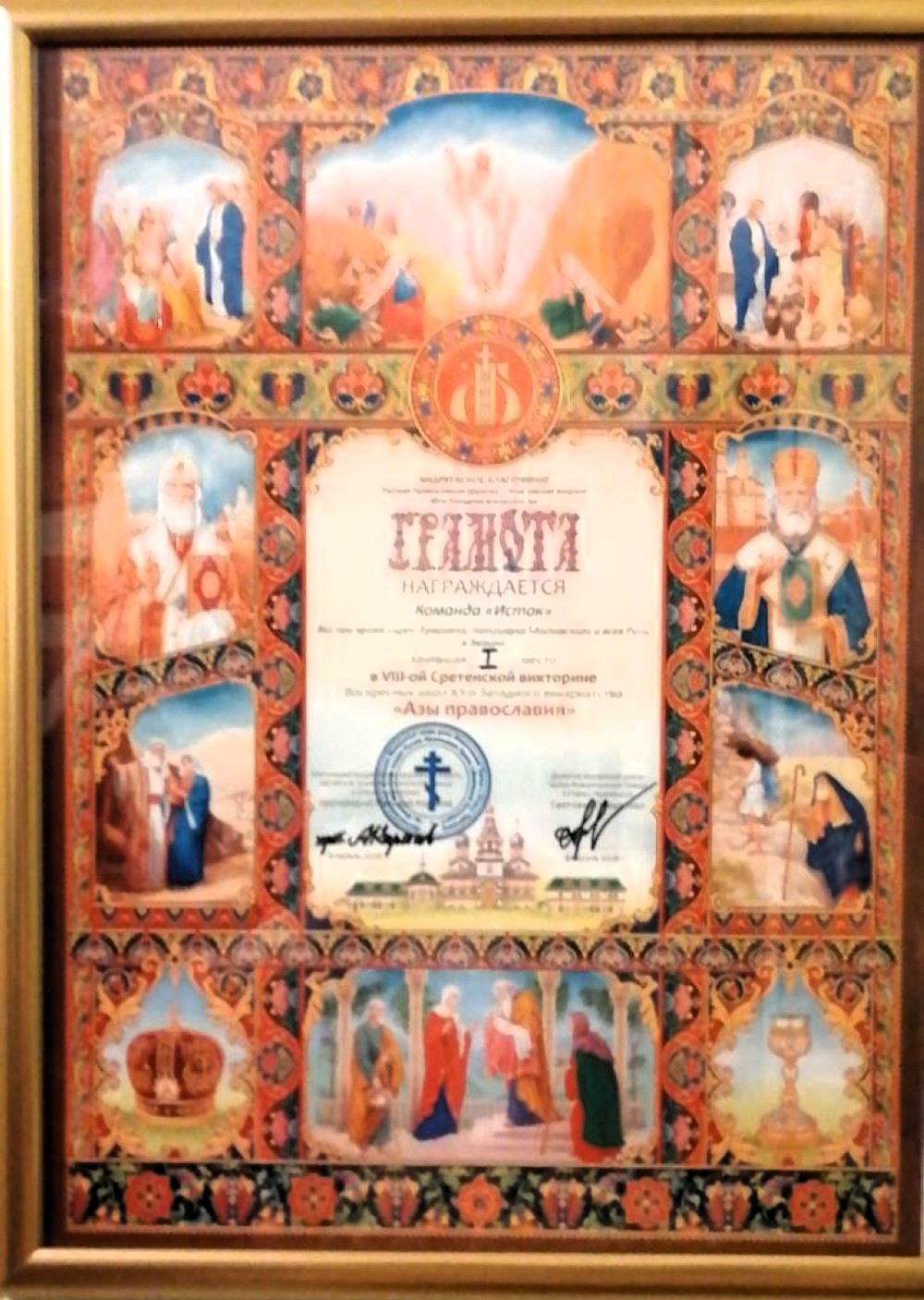 8 февраля воспитанники Воскресной школы "Исток" храма Священномученика Ермогена в Зюзине заняли первое место в VIII Сретенской викторине «Азы православия», которая проводится ежегодно среди Воскресных школ Юго-Западного викариатства города Москвы.