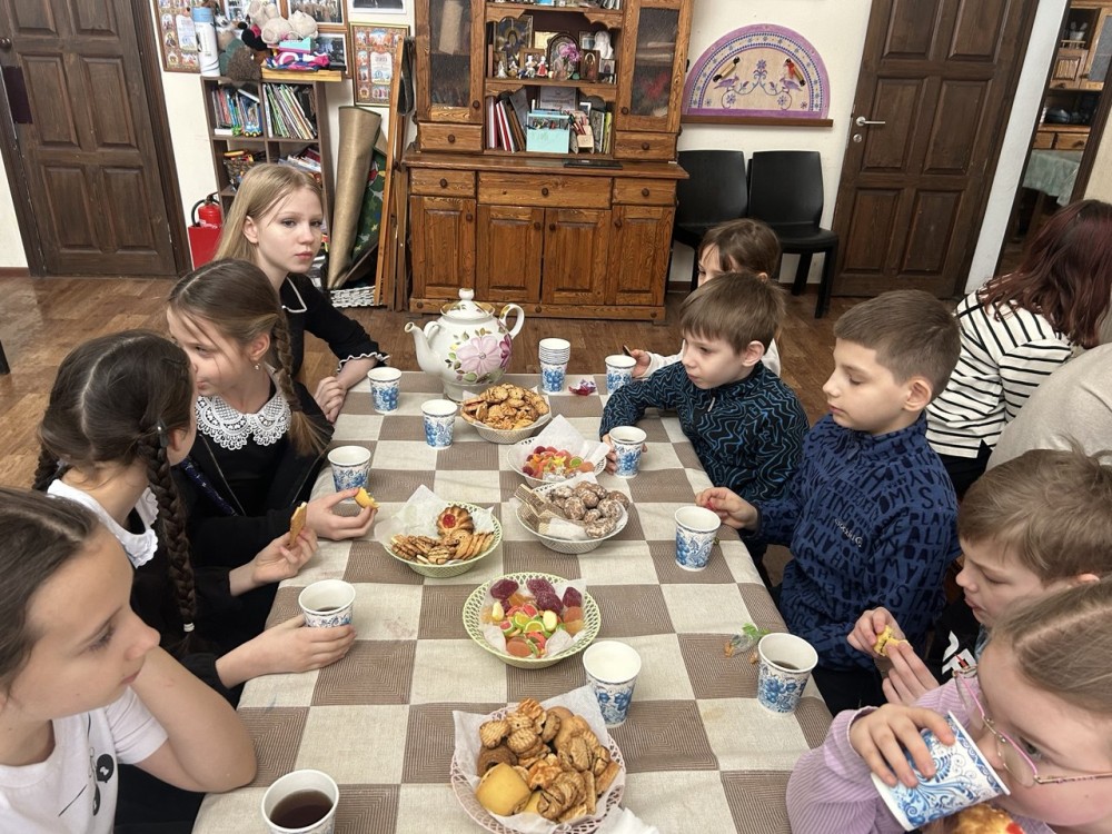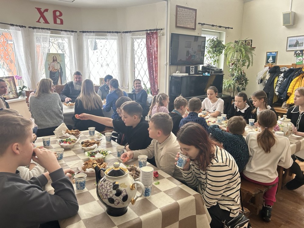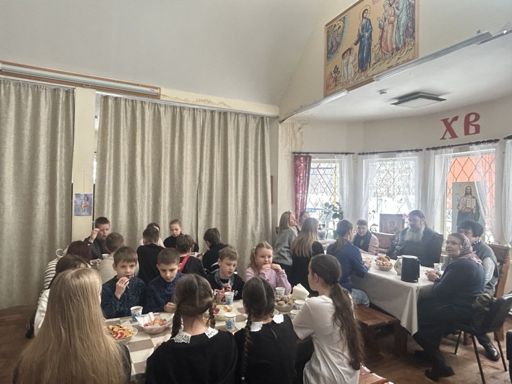Продолжилась встреча в Воскресной школе за чаем. Дети и взрослые во время беседы задавали вопросы настоятелю. Встреча получилась очень тёплой и запоминающейся.