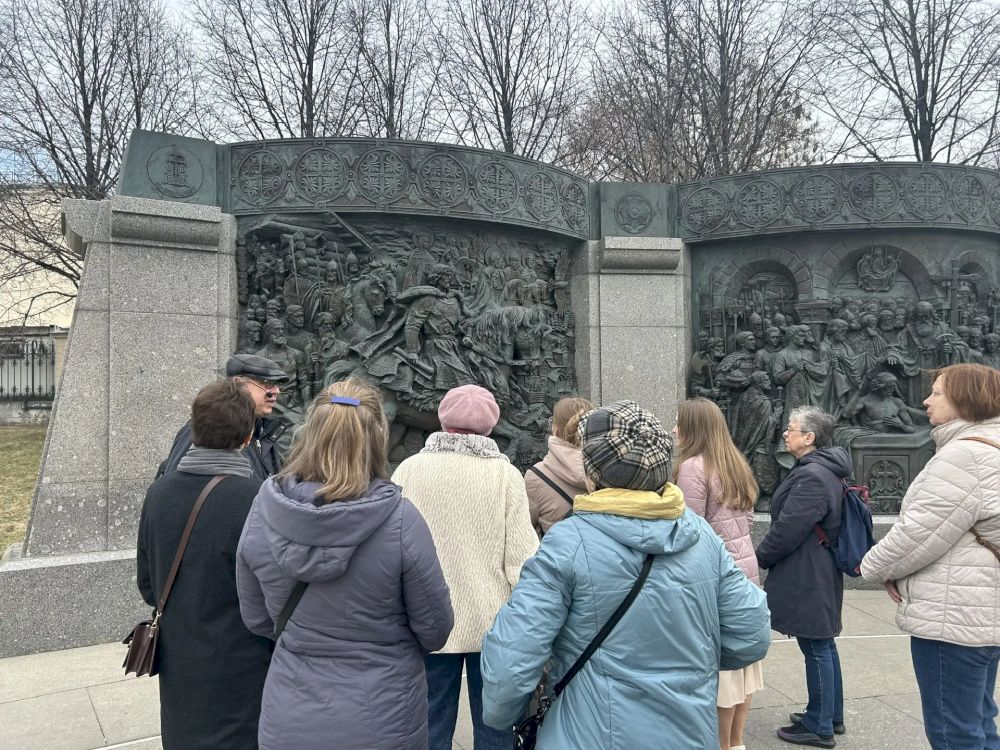 На всех остановках Евгений Игоревич рассказывал историю жизни этих выдающихся людей, удостоившихся чести быть запечатлёнными в памятниках на центральной площади столицы.