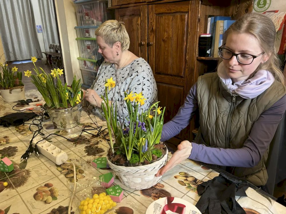 На творческом мастер классе по флористике под руководством Дарьи Бельских дети и взрослые создали праздничные цветочные садики: первые весенние цветы в декоративном оформлении.
