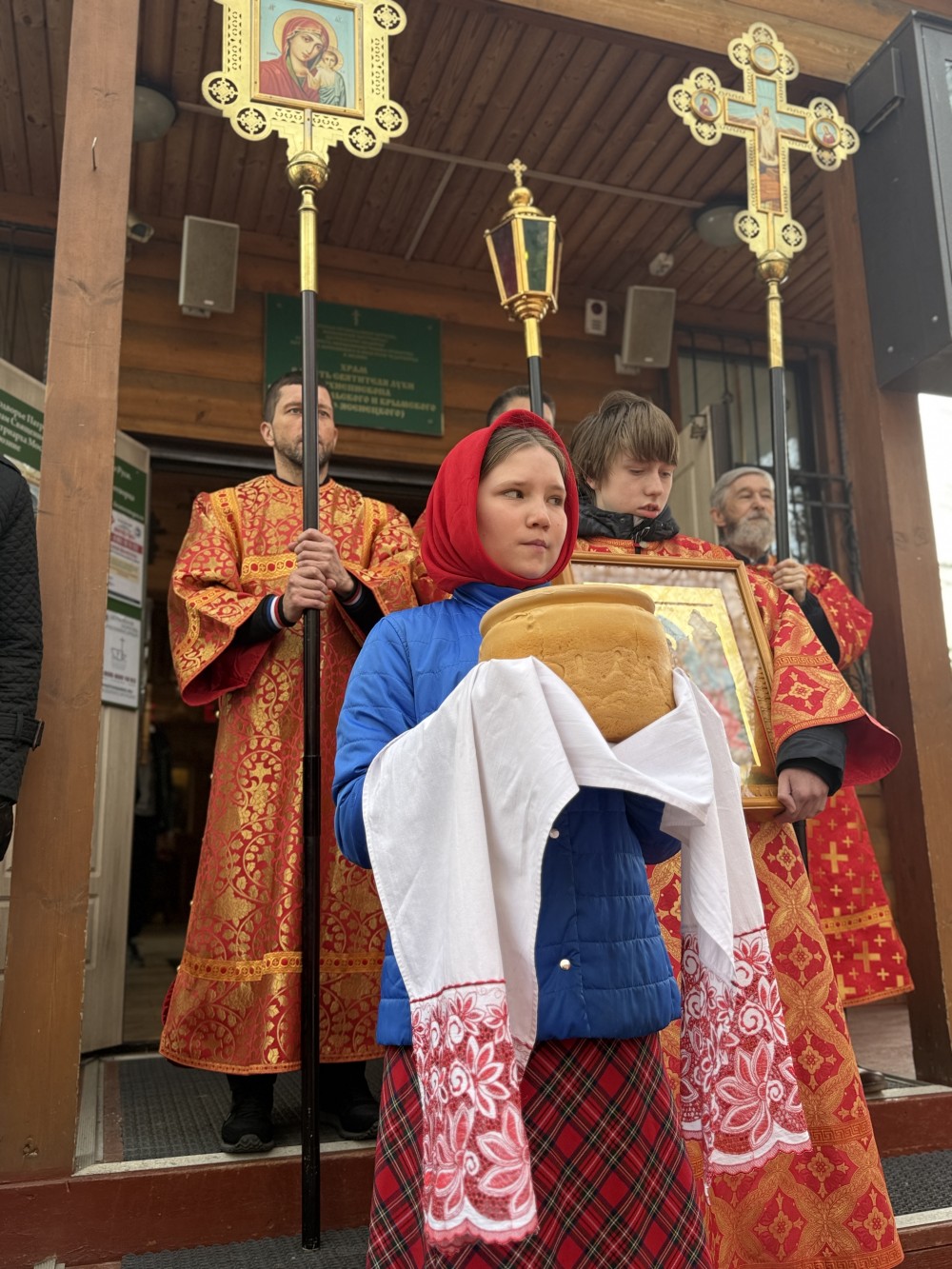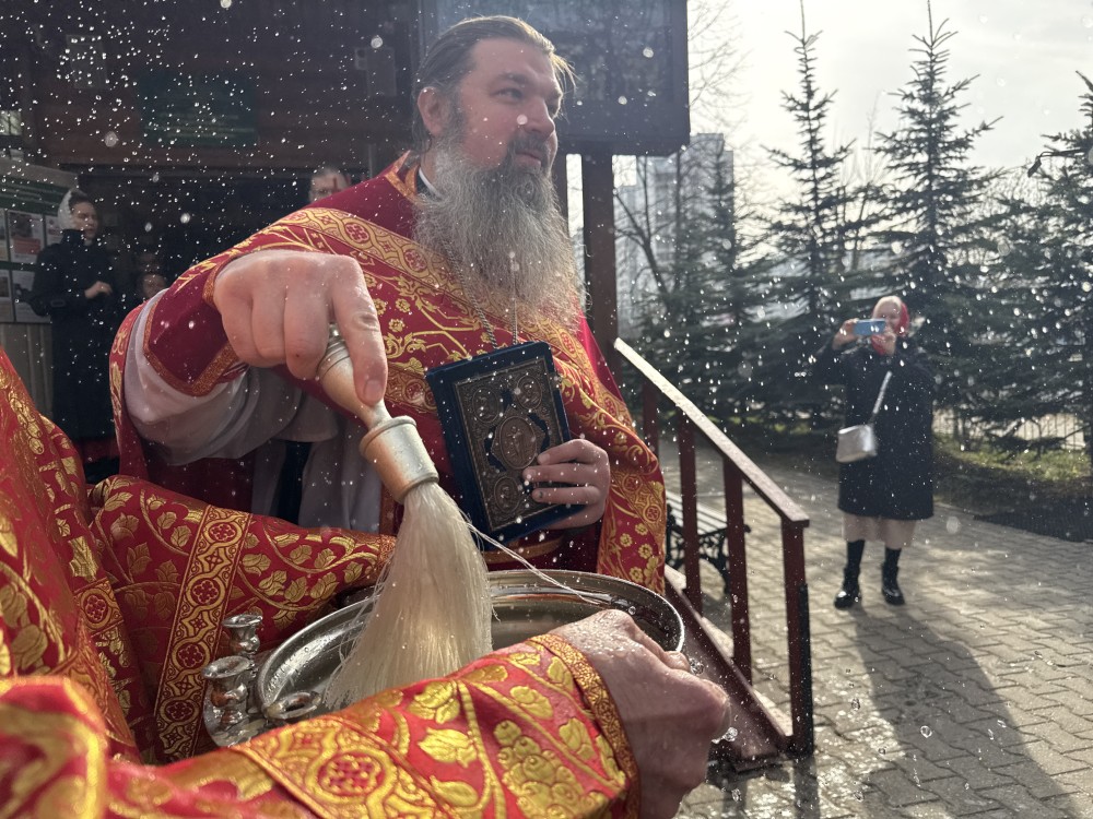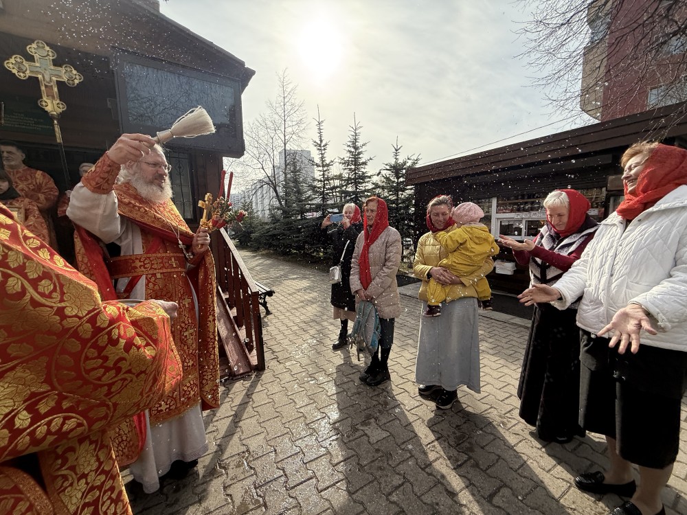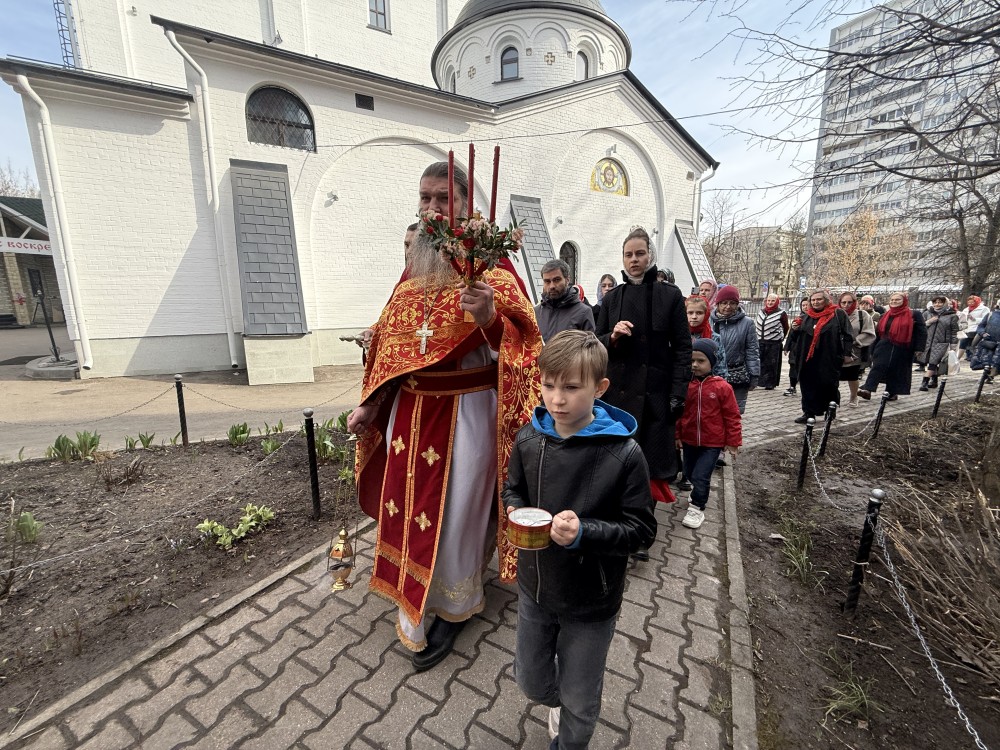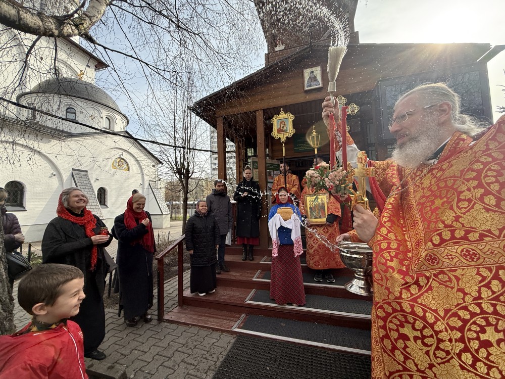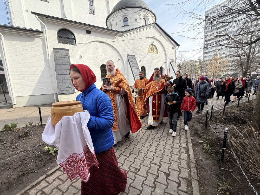 По окончании Божественной Литургии совершен Крестный Ход с участием прихожан храма, сопровождаемый Пасхальным колокольным звоном, возвещающим благую весть о Воскресении Спасителя и окропление прихожан Святой водой.