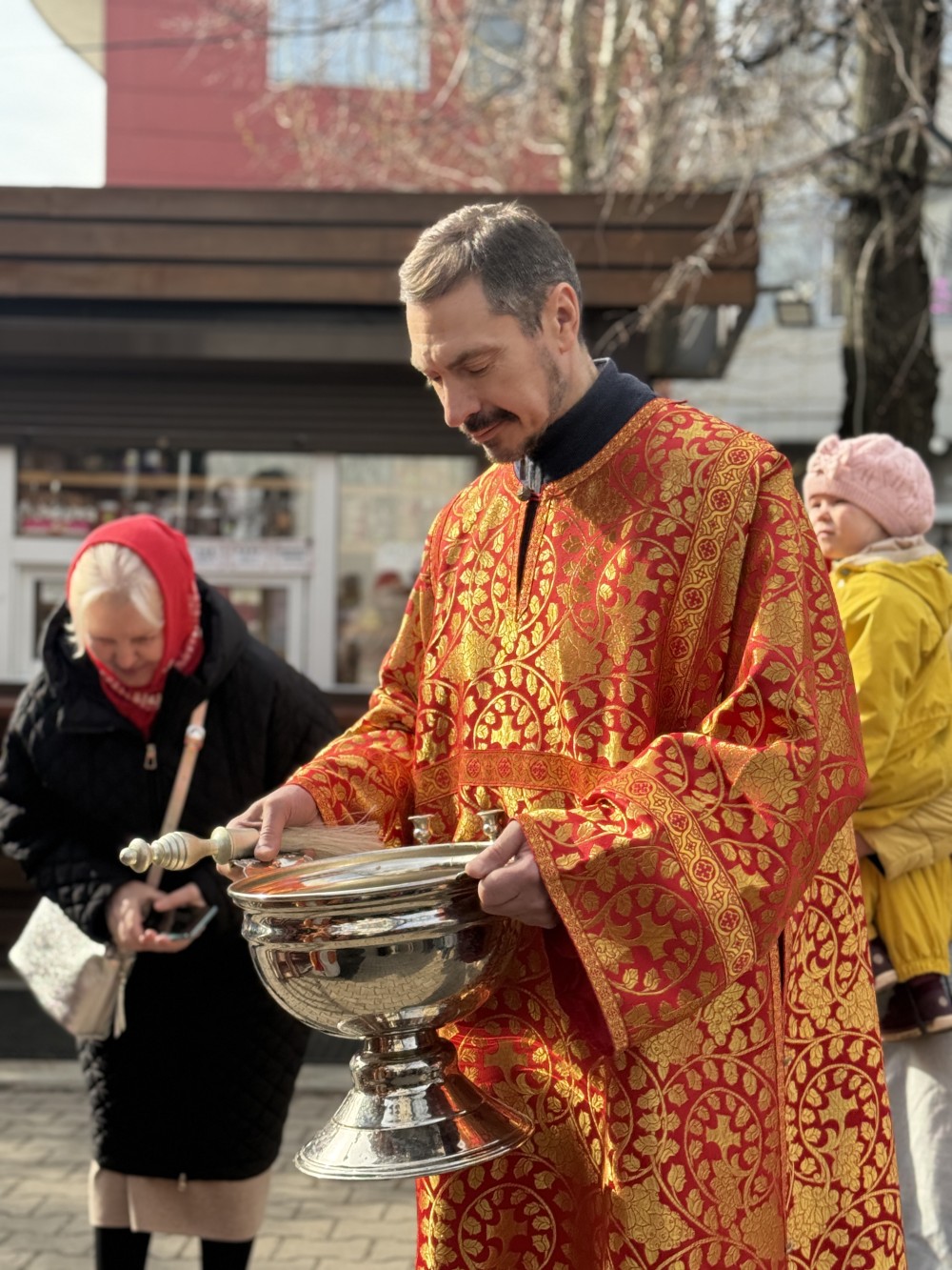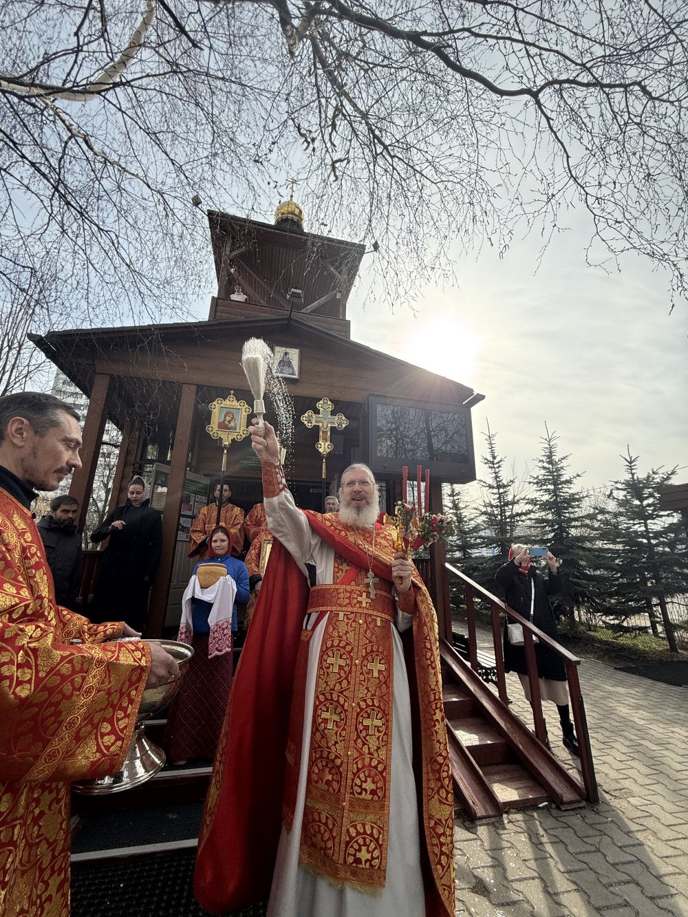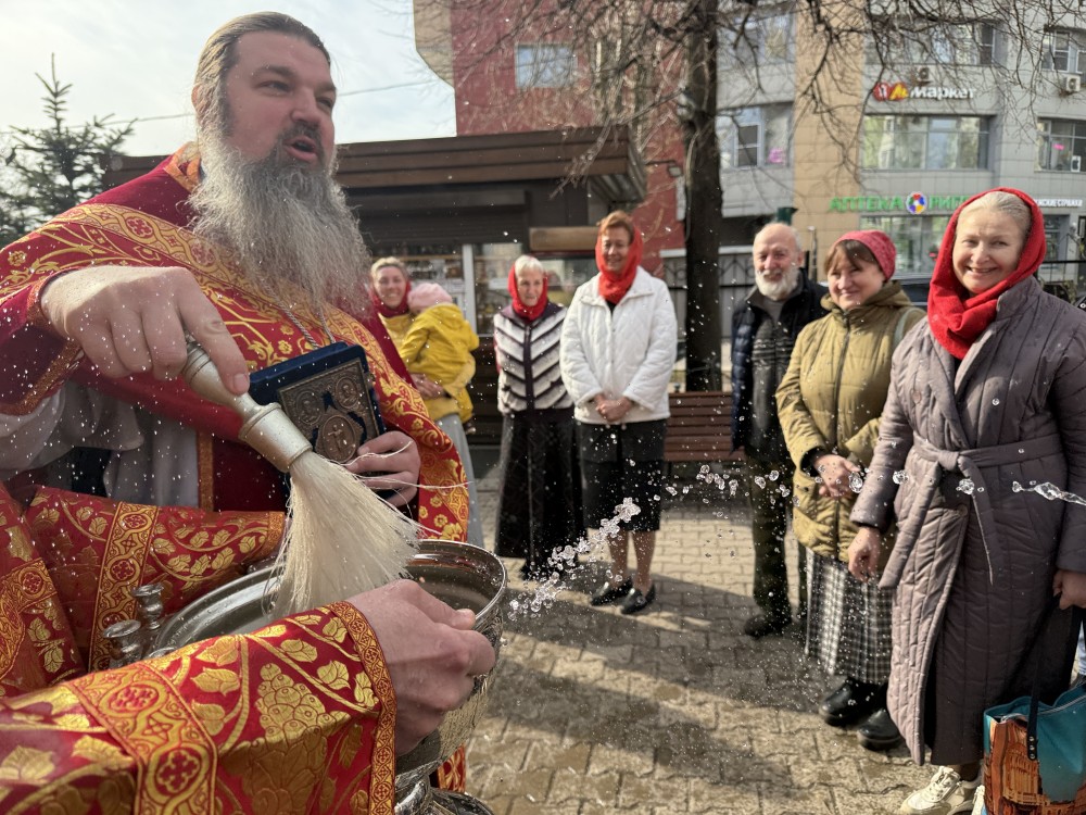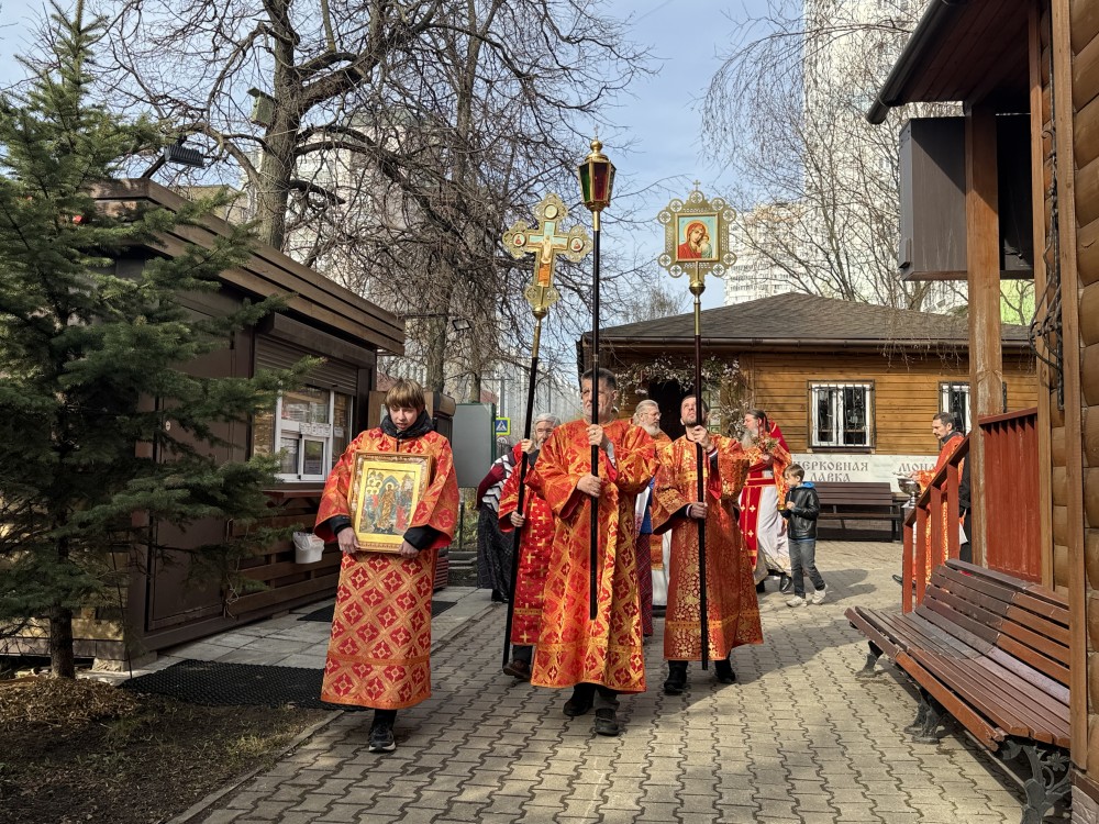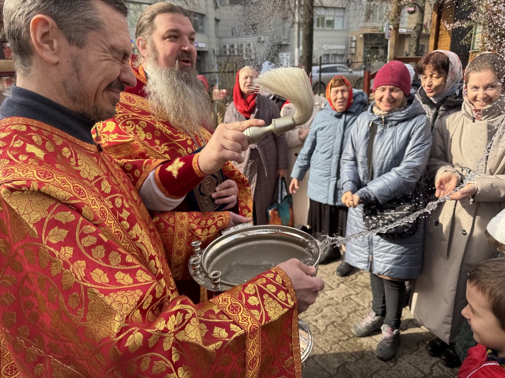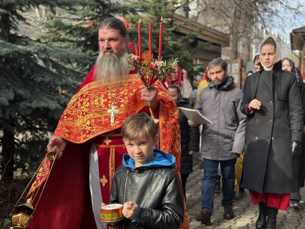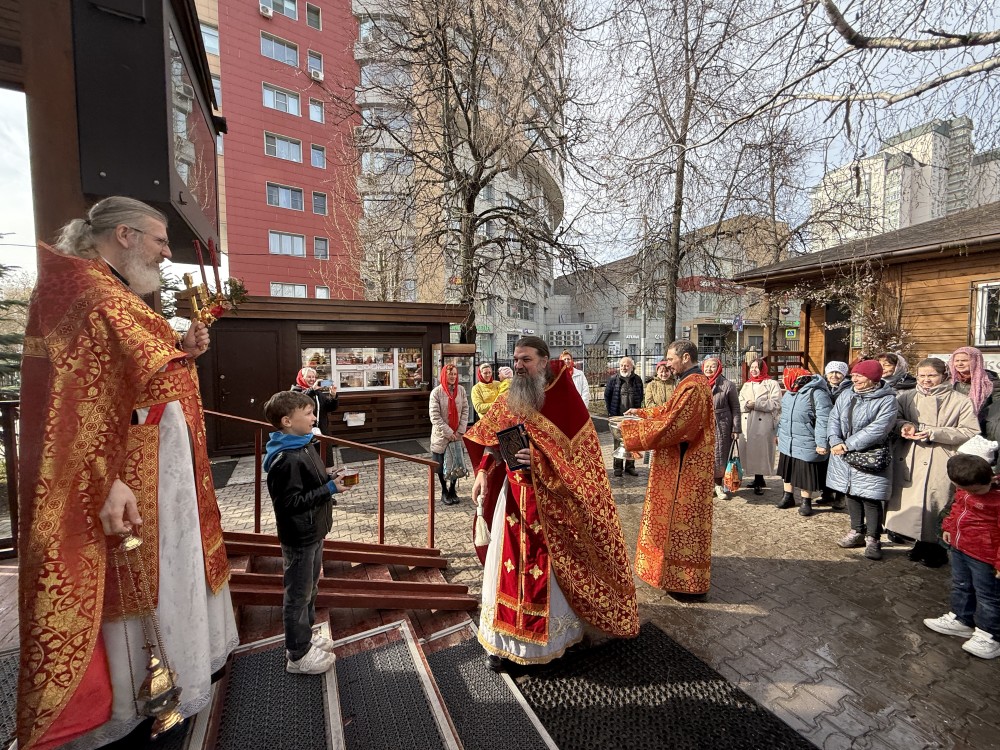 По окончании Божественной Литургии совершен Крестный Ход с участием прихожан храма, сопровождаемый Пасхальным колокольным звоном, возвещающим благую весть о Воскресении Спасителя и окропление прихожан Святой водой.