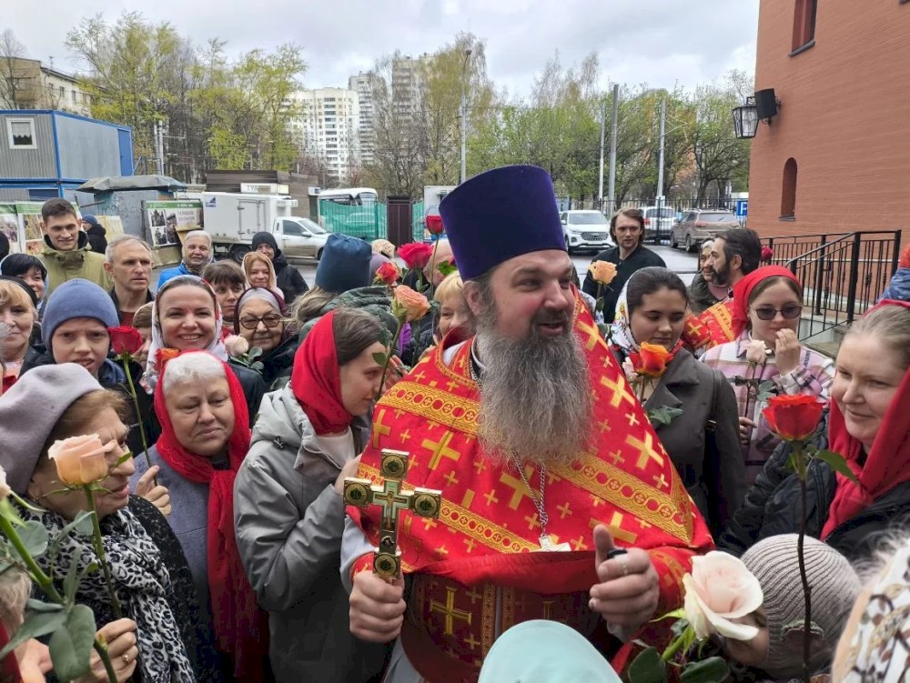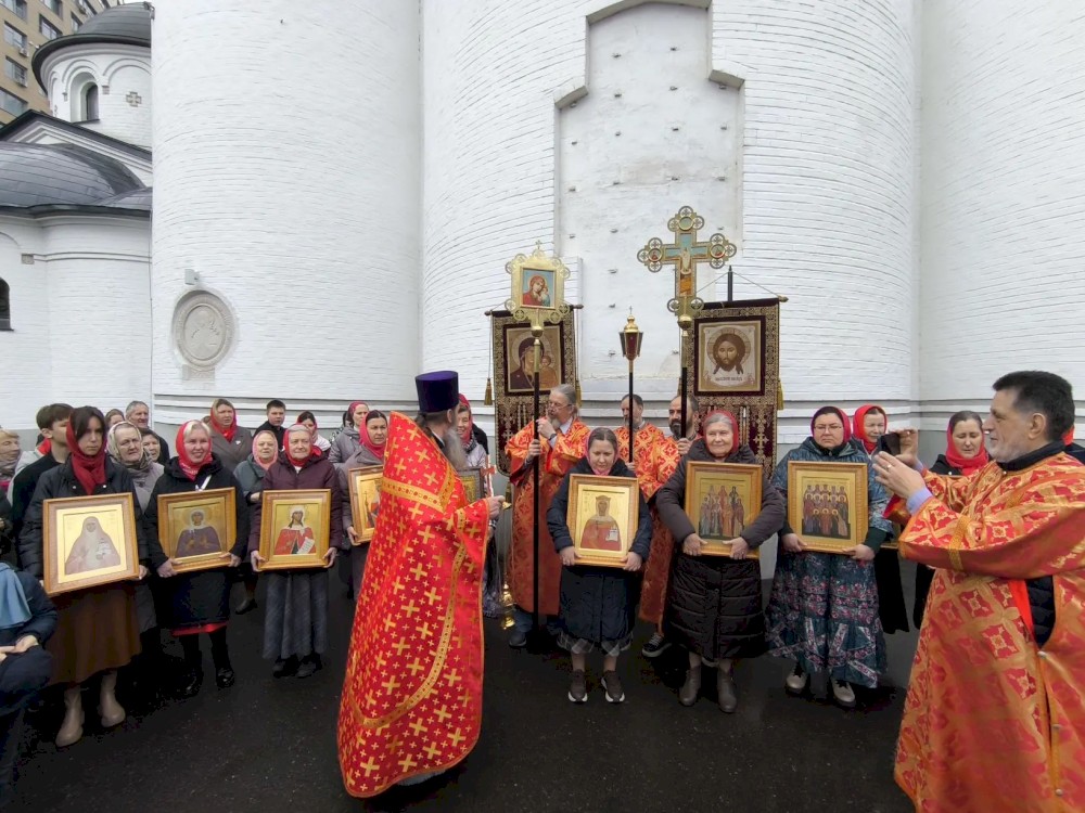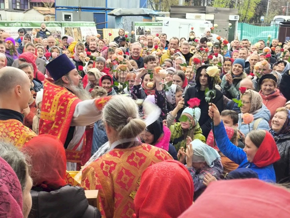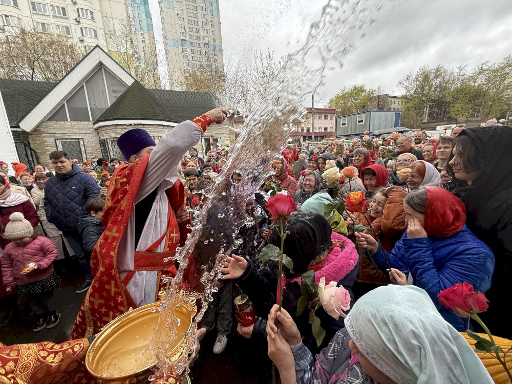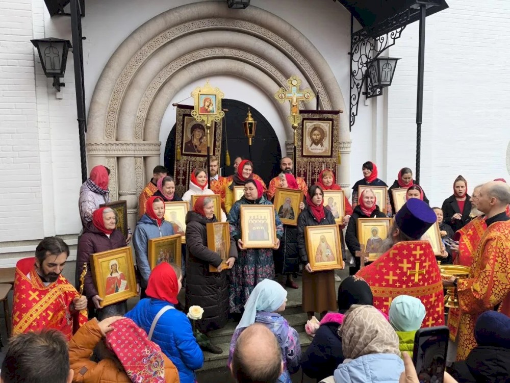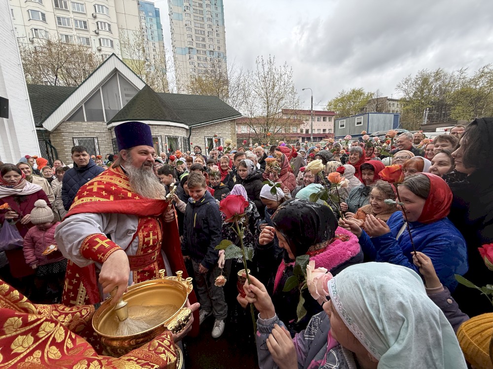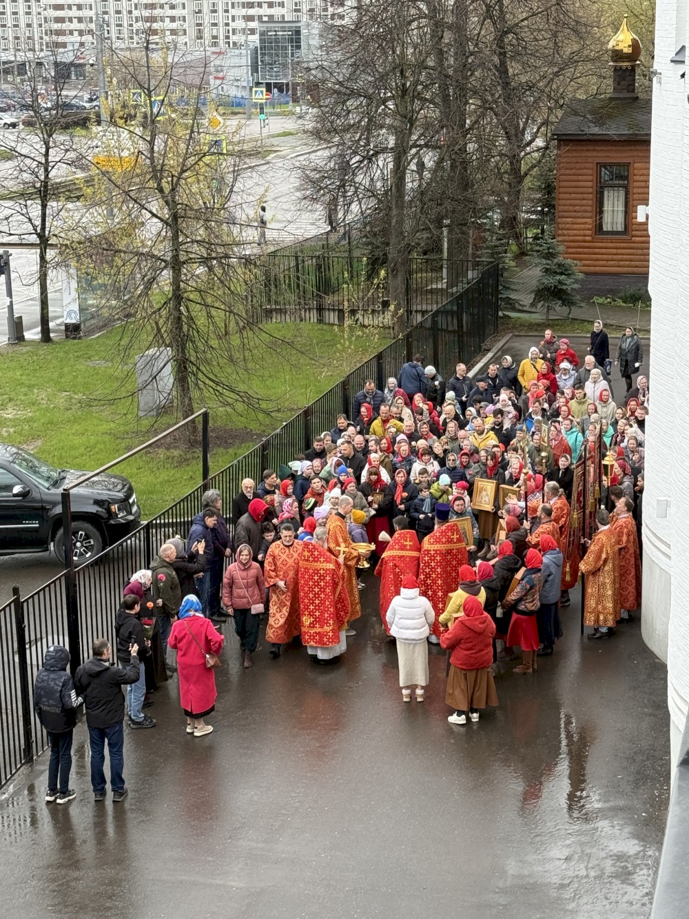 В завершение под сопровождение праздничного колокольного звона состоялся торжественный Крестный ход с участием прихожанок храма, которые несли в руках цветы и иконы с ликами святых жен.
